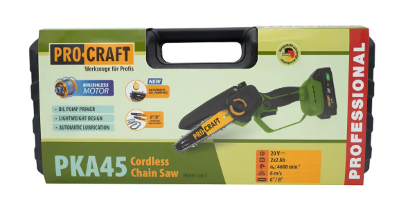 Аккумуляторная мини-пила Procraft PKA45 (2 АКБ, кейс) — это практичное решение для дачи, сада и строительных работ. Инструмент отличается компактностью, удобством и высокой производительностью. Благодаря бесщеточному двигателю и возможности работы от аккумулятора 20 В, пила сочетает в себе мощность и мобильность, позволяя использовать её там, где нет доступа к электросети.