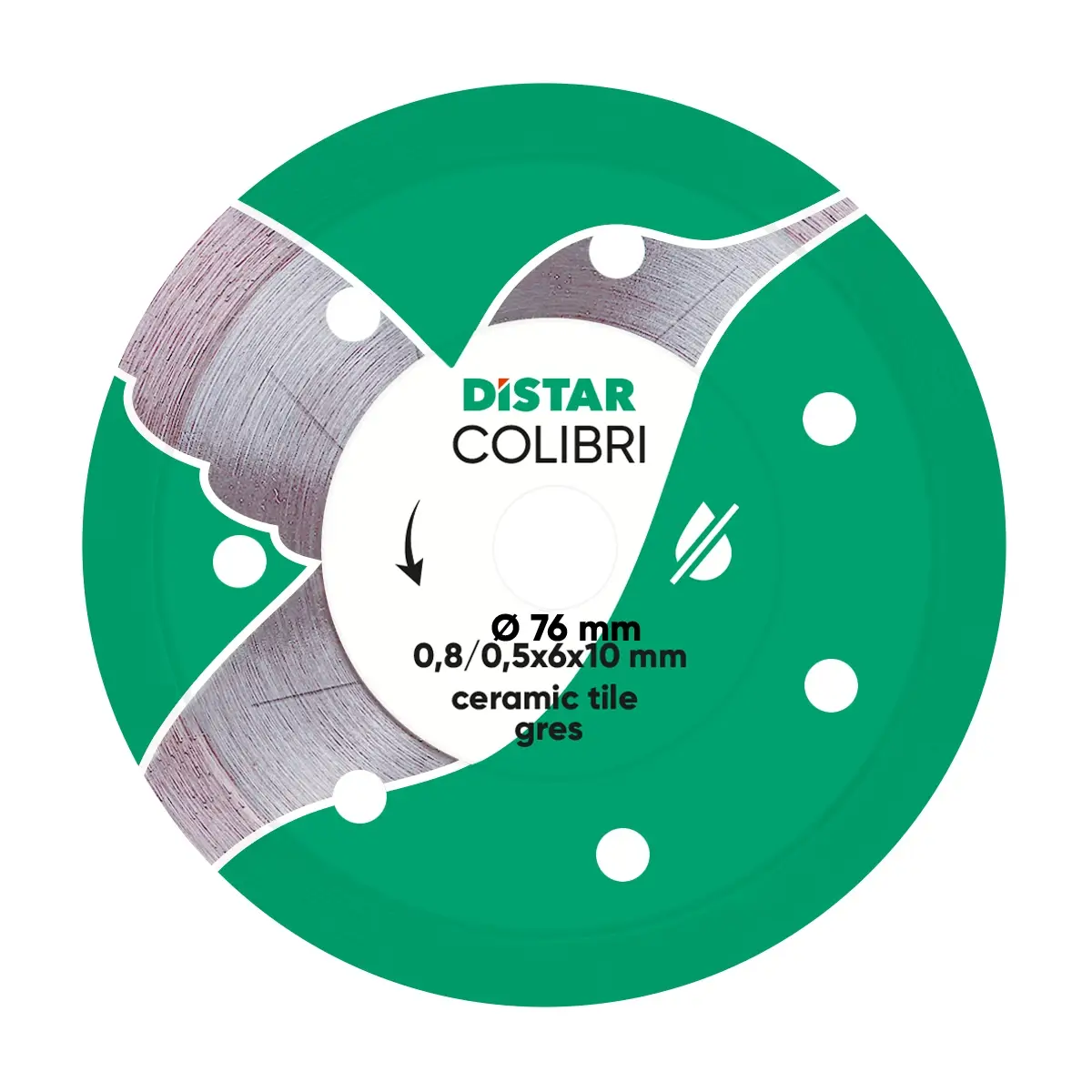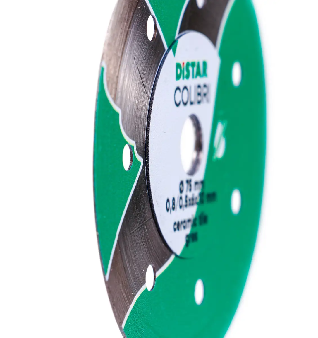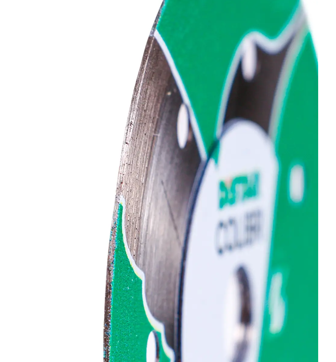 Диск Colibri имеет сплошной алмазоносный слой толщиной 0,8 мм, что позволяет получить финальную ширину пропила после доработки острых кромок до 1,0 мм.