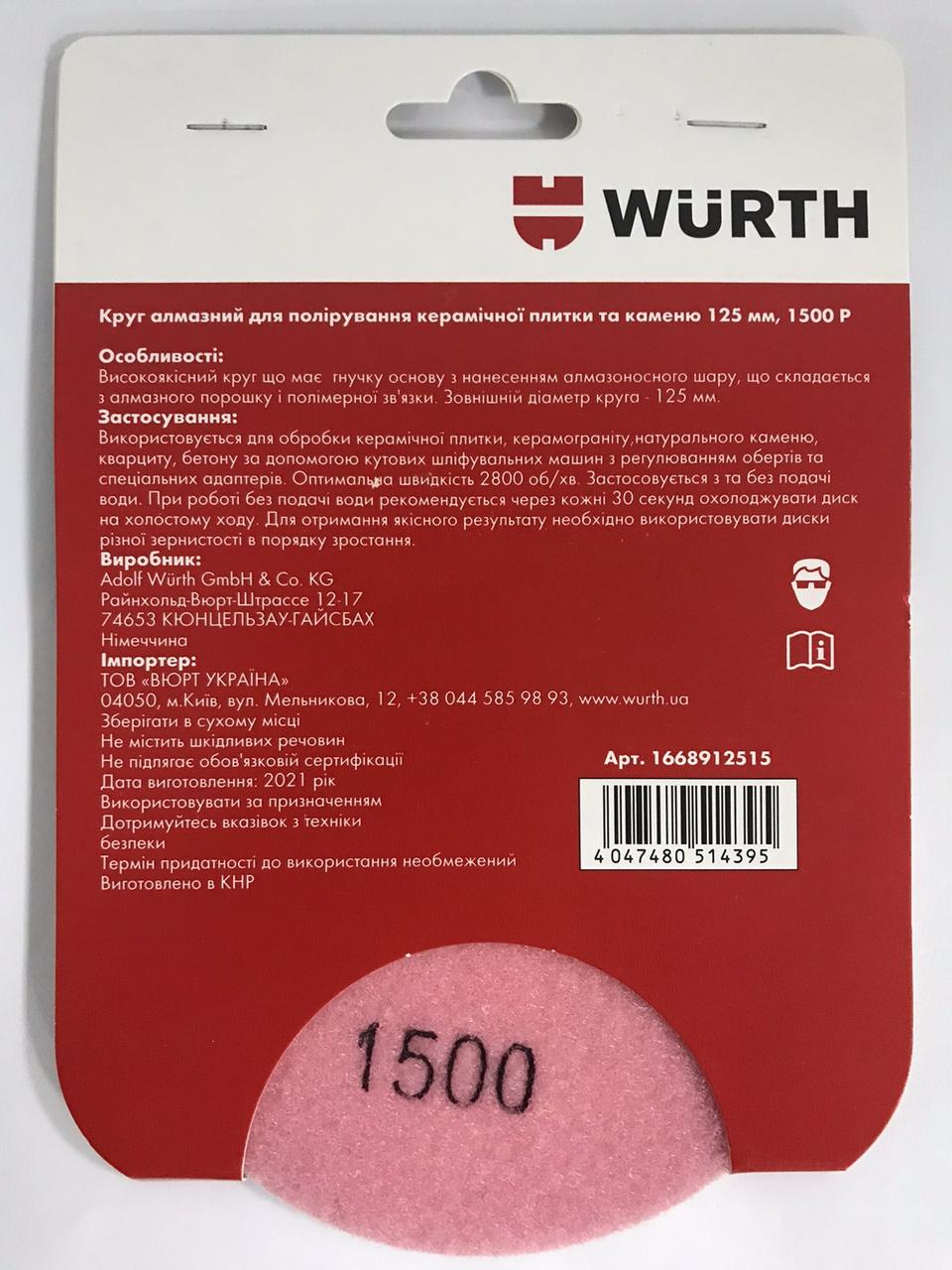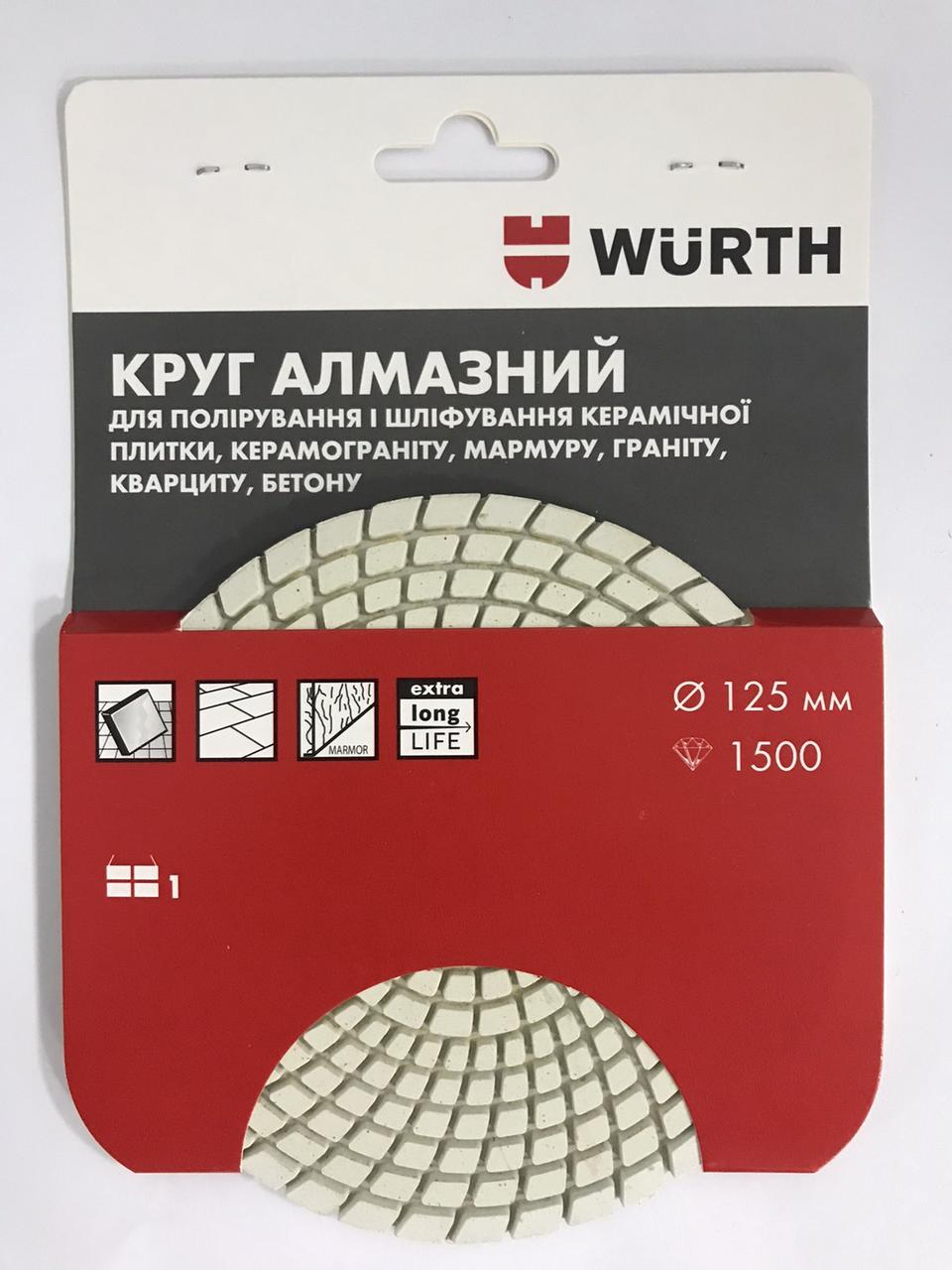 Круг алмазный Wurth 125мм/1500 для полировки и шлифовки керамической плитки, керамограниту, мармуру, граниту, кварцыту, бетону