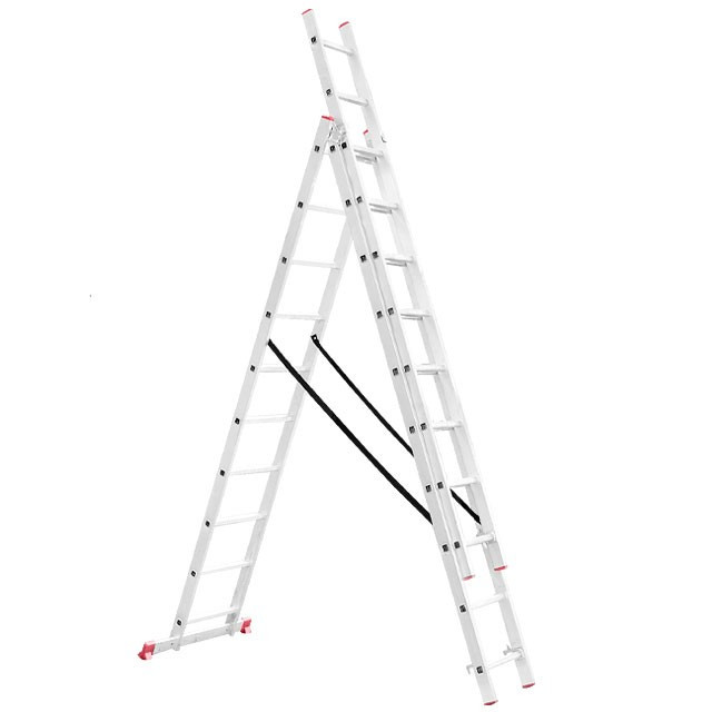 Универсальная алюминиевая 3-х секционная раскладная лестница LT-0310 ТМ INTERTOOL незаменима как в строительстве так и в быту. Лестница LT-0310 изготовлена из высококачественного экструдированного алюминиевого профиля, соответствует европейскому стандарту EN131. При весе 15,4 кг выдерживает нагрузку до 150 кг. Каждая из 3-х секций оснащена 10 рифлеными ступенями шириной 280 мм. Высота в разложенном виде 6766 мм, в сложенном 2846 мм. Противоскользящие опорные заглушки обеспечивают надежное сцепление с опорной поверхностью, препятствуют скольжению. Может применяться как приставная, выдвижная лестница и свободностоящая стремянка. Атмосферостойкие ленты предотвращают самопроизвольное раздвижение боковин.