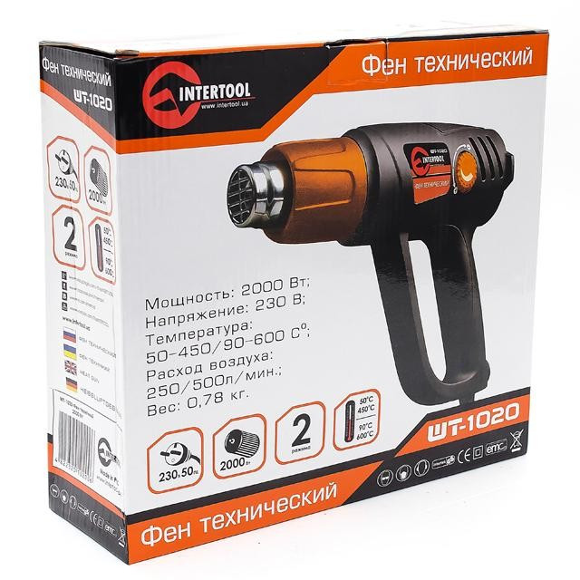 Технический фен для обжига INTERTOOL WT-1020 входит в линейку полупрофессионального инструмента INTERTOOL. Функциональность технического фена небольшая, а вот область его применения велика. В модели WT-1020 предусмотрено две скорости воздушного потока с возможностью плавной регулировки температуры потока воздуха в интервале от 50 до 450°C в первом режиме и 90-600°C во втором. Аналогично и со скоростью воздушного потока, где 250 л/мин в первом режиме и 500 л/мин во втором.