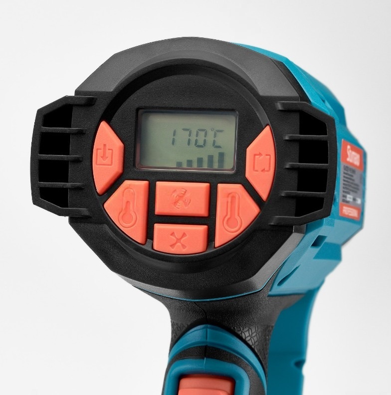 Строительный фен обладает широким диапазоном температуры. с двумя режимами настройки от 50 до 650 градусов, а также воздушный поток – 250-500 л/мин. Удобное расположение переключателя позволяет легко переключать режимы даже во время работы. Максимальная мощность – 2000 Вт. Кроме того, электроинструмент имеет двойную изоляцию, поэтому не требует заземления. Основные детали выполнены из стойкого металла, а корпус из высококачественной термостойкой пластмассы. Инструмент устойчив к износу и прослужит длительное время. Цифровой экран позволяет контролировать температуру и интенсивность потока воздуха. Прорезиненная рукоятка и небольшой вес устройства способствуют комфортному использованию инструмента без погрузки на руки оператора.