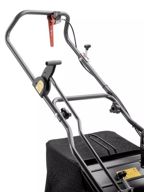 Для удобства настройки имеется центральная регулировка глубины прорезания, вместительный травосборник и ручка быстрого включения ножей в работу.