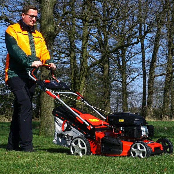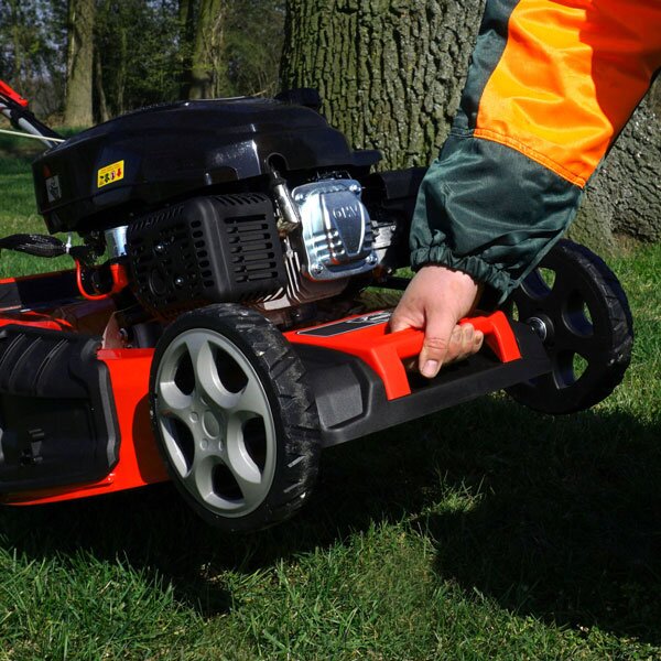 Тщательно продуманная конструкция цельного стального корпуса и колес с дополнительным захватом позволяет производить срез травы максимально близко к краю. Это позволит качественно обработать различные труднодоступные места (стены, живые изгороди, площадь вокруг кустов). Передняя ручка на косилке поможет при транспортировке, а так же уборке. С ее помощью Вы легко очистите газонокосилку снизу. При этом важно чтобы косилка стояла на колесах, а не лежала на боку иначе бензин и масло могут пролиться.