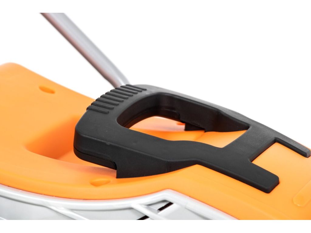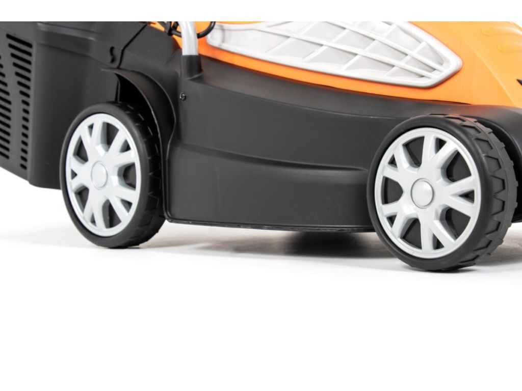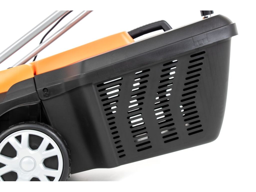Корпус газонокосилки выполнен из ударопрочного пластика. Эргономичная ручка для управления с покрытием софт-тач в точке захвата не скользит в руках и позволяет удобно управлять техникой. Прочные колеса легко проезжают по траве, обеспечивая максимальный комфорт использования. Для предотвращения неисправностей есть защита от перегрева. Простая в эксплуатации, легкая и маневренная, эта электрическая газонокосилка не требует значительных физических усилий или специальных навыков.
