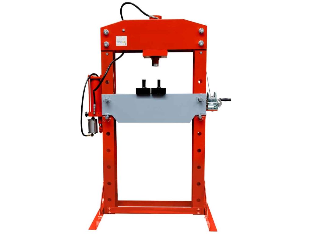 Жесткая и стойкая сварная конструкция с вертикальным расположением пресса и опорный стол с регулировкой по высоте позволяют выполнять задачи с большой точностью. Гидравлический цилиндр с пневматическим управлением и двухступенчатый ручной насос облегчают работу и делают ее удобнее. Манометр для отображения рабочего усилия позволяет контролировать процесс прессования. Качественные и прочные материалы изготовления гарантируют надежность и длительный срок службы станка.