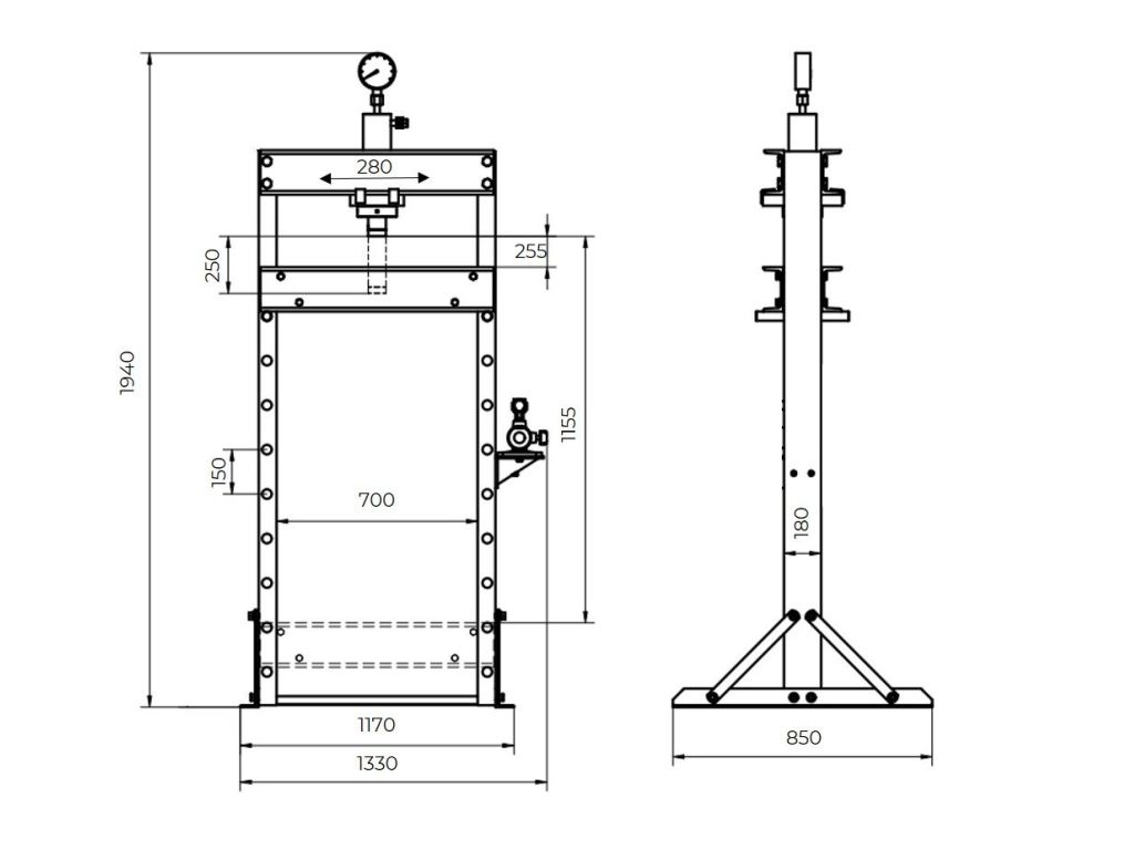 Оригинальная сварная конструкция с вертикальным расположением пресса и дополнительными ребрами имеет отличную жесткость и стойкость. Опорный стол регулируется по высоте. Пресс-блок можно перемещать горизонтально. Прочный одноступенчатый гидроцилиндр и пневматический блок с подключением 1/4” обеспечивают высокую эффективность работы.