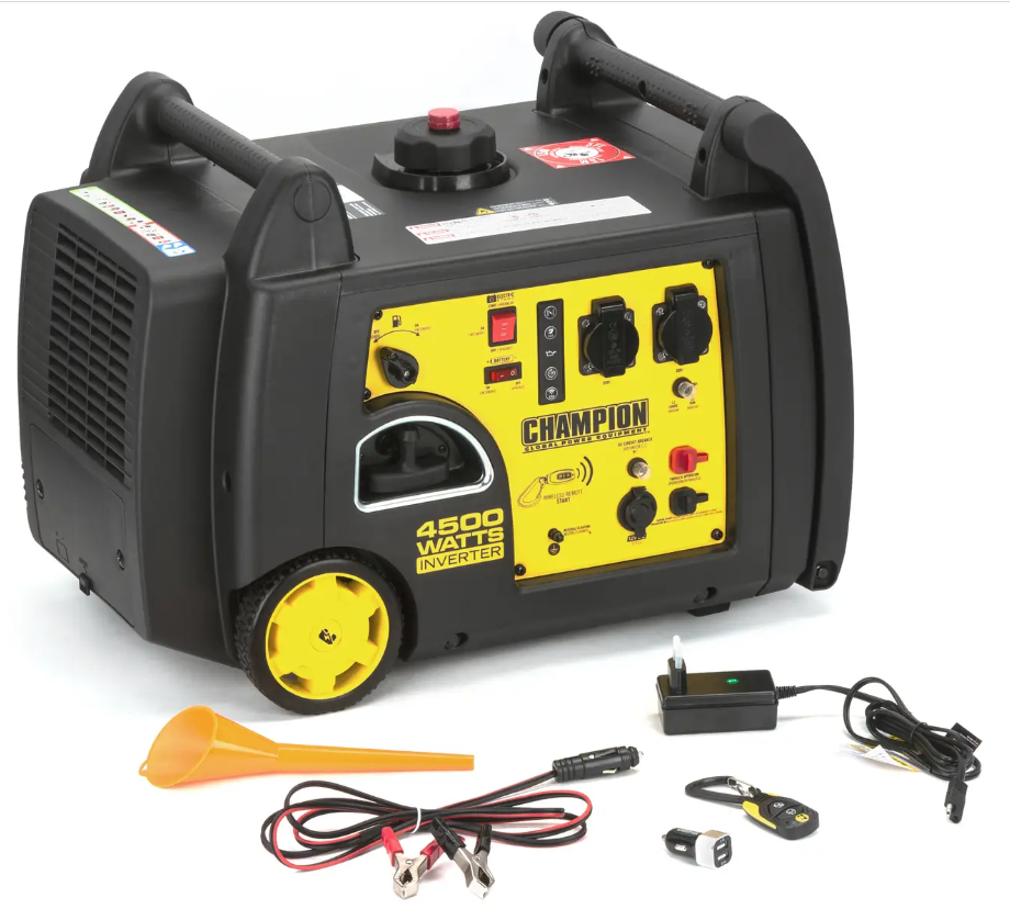 - Расширенная комплектация. Недорогой бензиновый генератор Champion C4500iES комплектуется маслозаливной лейкой, USB-адаптером с 2 выходами, пультом ДУ в виде брелока, кабелями для зарядки аккумулятора и «умным» зарядным устройством.