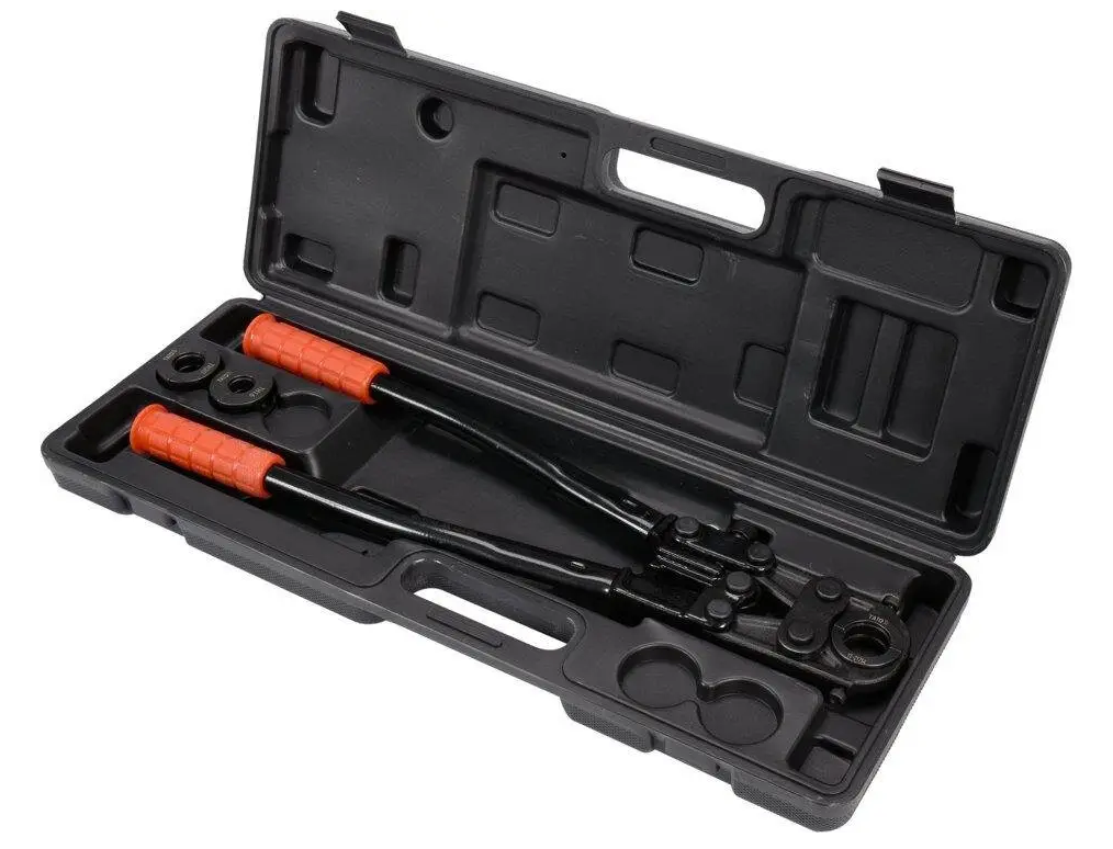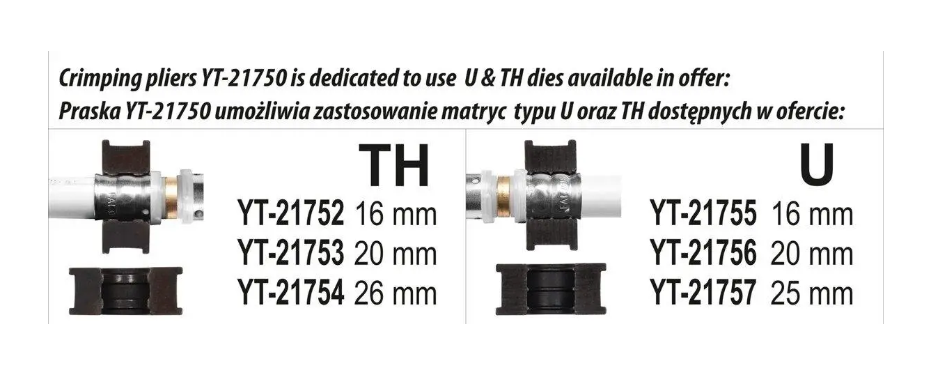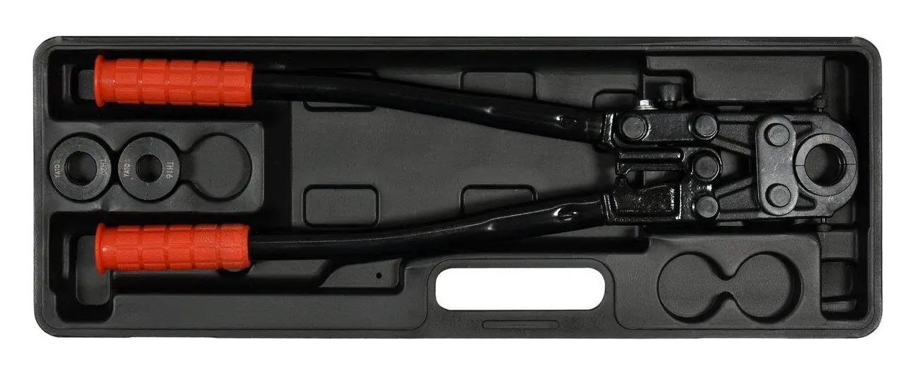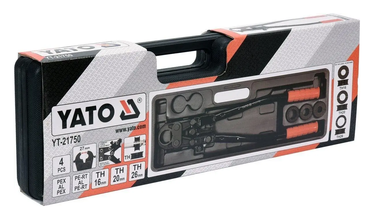 Пресс-клещи для металлопластиковых труб YATO YT-21750 с набором 3 насадок типа TH, предназначенный для обжима фитингов на трубах PEX-AL-PEX и PERT-AL-PERT.