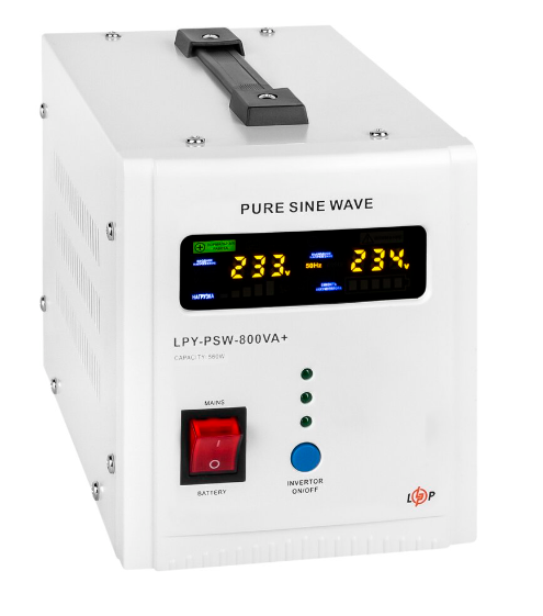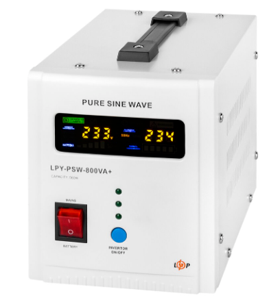 Модель ИБП / UPS Logicpower LPY-PSW-800VA + LP4153 для котла и аварийного освещения, с чистой синусоидой: с показателями мощности 480 Вт, входным напряжением 140-275 В, с функцией стабилизации напряжения и холодным стартом (функция «холодного» запуска позволяет включить ИБП без основного питания). Батарея: подключаемая внешняя 12 В (приобретается отдельно).