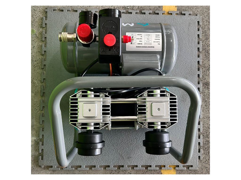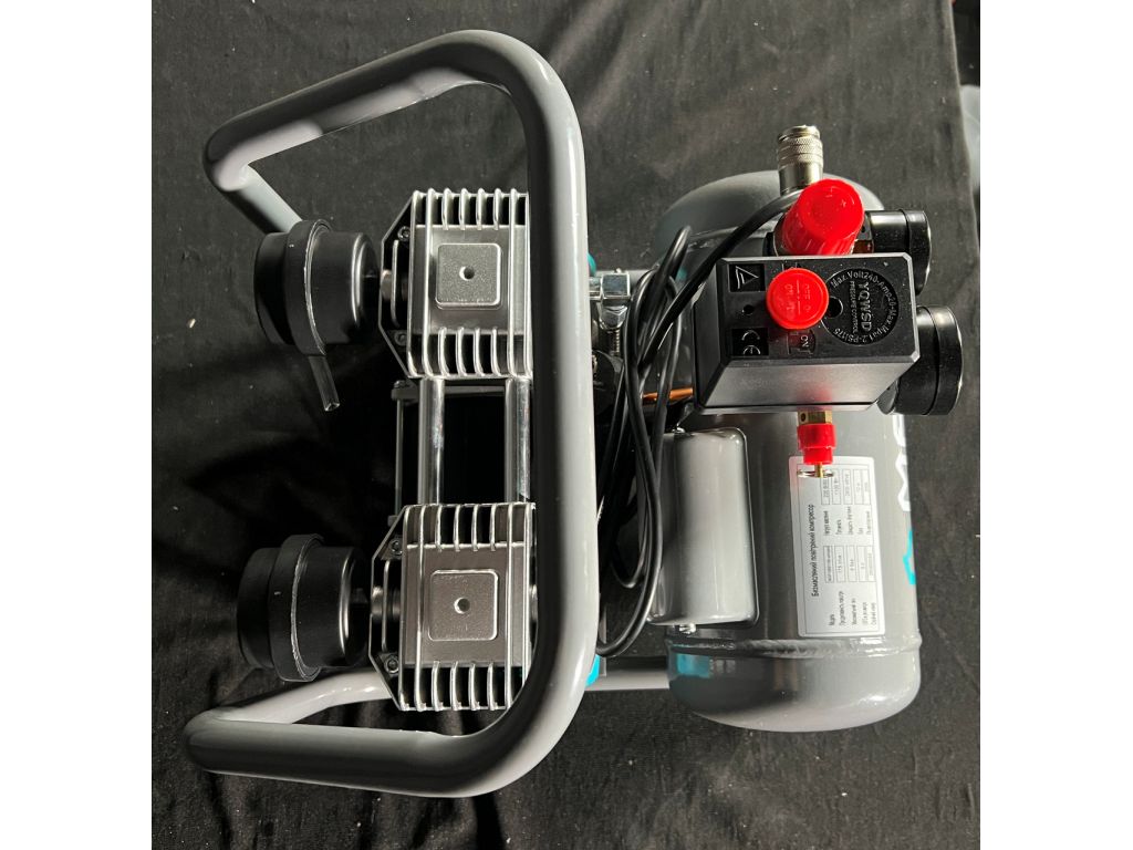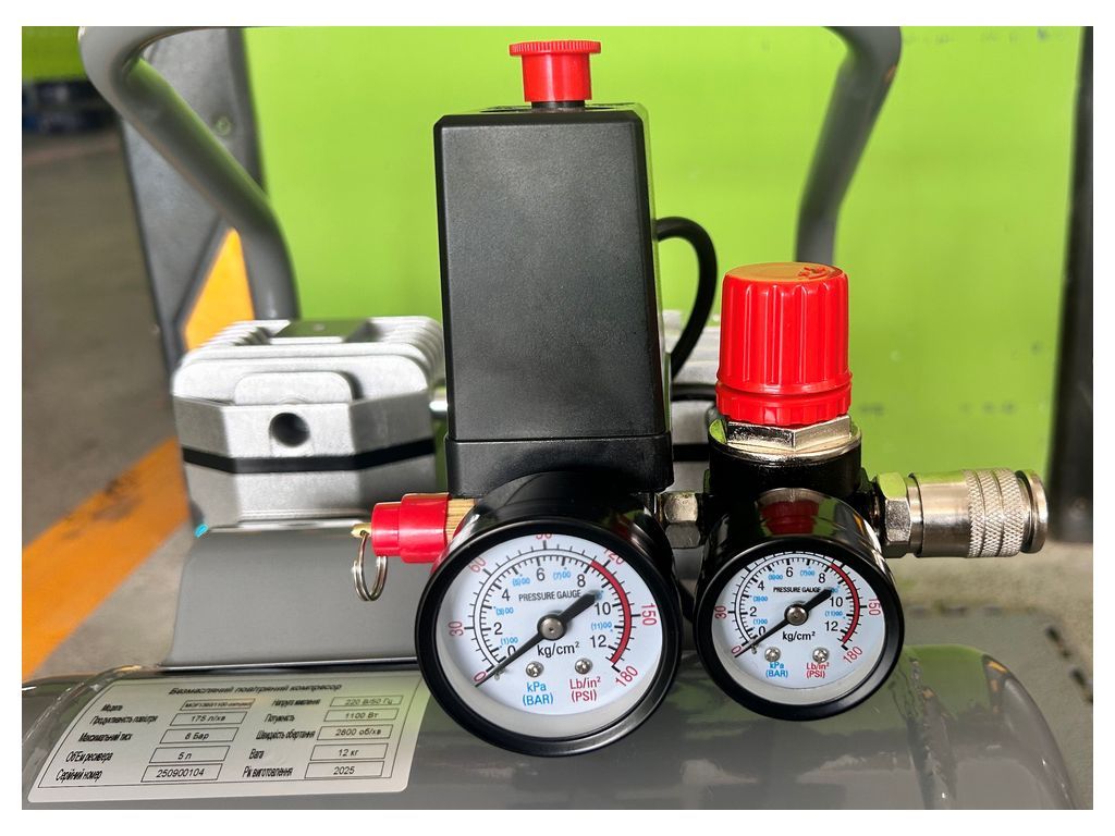 Двигатель мощностью 800 Вт/ 1,1 кВт имеет медную обмотку и тепловую защиту, что делает его устойчивым к перегреву. Прямой привод уменьшает потери мощности и делает конструкцию более легкой и компактной. Редуктор давления и 2 манометра (показывают давление в ресивере и на выходе с редуктора) позволяют корректировать и контролировать текущее давление. Резиновые ножки уменьшают шум и вибрации, а усиленная верхняя ручка позволяет легко перемещать этот портативный безмасляный компрессор по рабочей зоне.