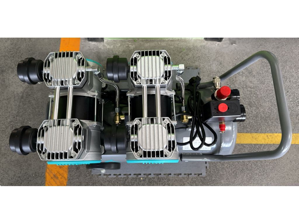 Тефлоновые поршневые кольца и антифрикционное покрытие цилиндров обеспечивают стабильную работу без масла и 100% отсутствие в сжатом воздухе масляного тумана. Массивные алюминиевые ребра на каждом цилиндре и принудительное охлаждение с помощью мощных вентиляторов поддерживают стабильную температуру поршней и снижают риск тепловой деформации. Блок управления с прессостатом, редуктором давления, манометрами для контроля давления в ресивере и на выходе с редуктора, предохранительным и обратным клапанами делают этот двухпоршневой безмасляный компрессор удобным в эксплуатации, позволяя точно контролировать и быстро корректировать параметры работы.
