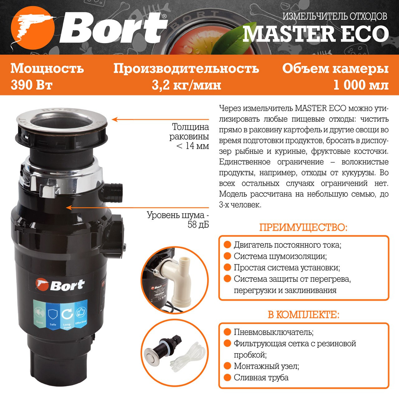 Через этот измельчитель можно утилизировать любые пищевые отходы: чистить прямо в раковину картофель и другие овощи во время подготовки продуктов, бросать в диспоузер рыбные и куриные, фруктовые косточки. Единственное ограничение – волокнистые продукты. Поэтому от идеи утилизировать отходы от кукурузы или артишока лучше отказаться. Во всех остальных случаях ограничений нет. Модель BORT MASTER ECO рассчитана на небольшую семью, до 3-х человек. Если в квартире живет больше людей, следует рассмотреть более мощные модели.
