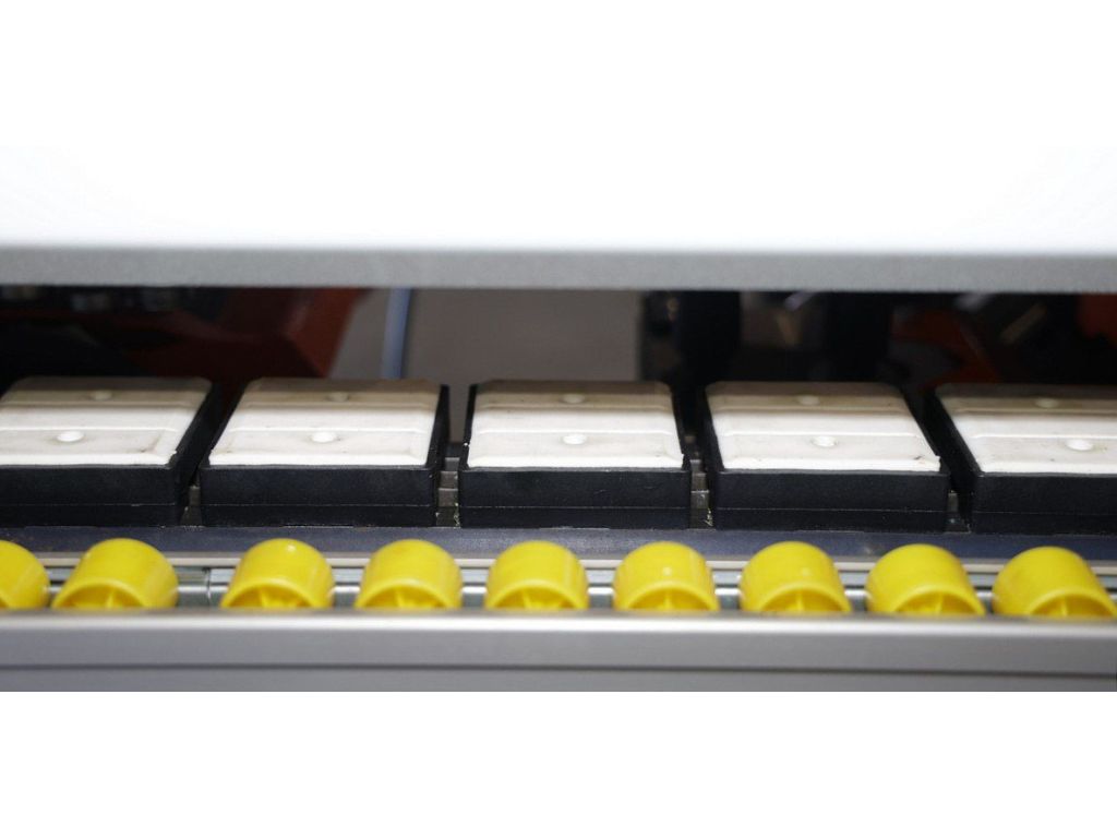 На входе детали установлен датчик, который фиксирует начало и конец детали и с помощью энкодера, установленного на валу транспортера, с высокой точностью определяет, в какой момент времени должен срабатывать каждый узел станка.
