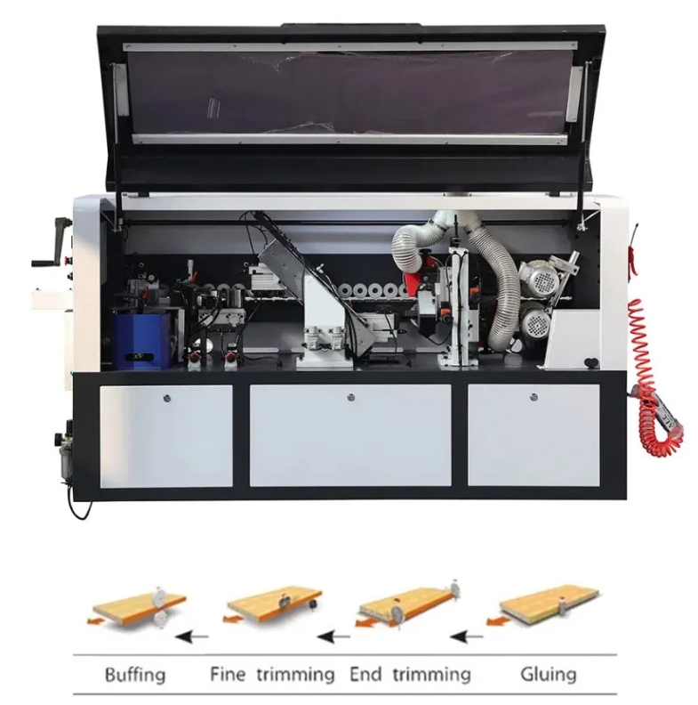 - Конструкция станка позволяет осуществлять автоматическое нанесение клея и кромочного материала, фрезерование свесов и подрезку торцов.