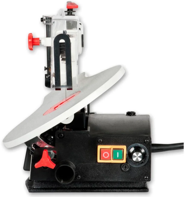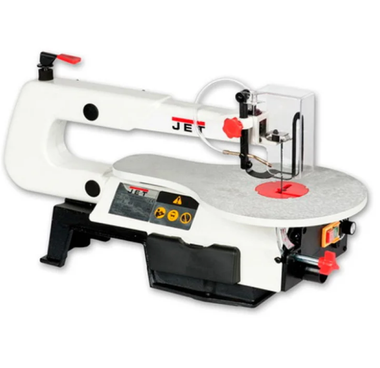 Jet JSS-16A – любительский станок для выпиливания сложных радиусов в не слишком крупных заготовках из древесины, ДСП, ДВП, фанеры или пластмассы. Модель представляет собой улучшенную модификацию хорошо известного лобзикового станка Jet JSS-16 и имеет ряд интересных конструктивных особенностей, выгодно отличающих ее от аналогов других марок. Прежде всего, это универсальность в отношении используемых полотен: можно устанавливать пилки как со штифтовым креплением, так и без него. Важно отметить удобное верхнее расположение рычага натяжения полотна. Новое усовершенствование в конструкции – возможность изменить ориентацию плоскости распила: вдоль или поперек продольной оси станка, смотря как удобнее или привычнее оператору.