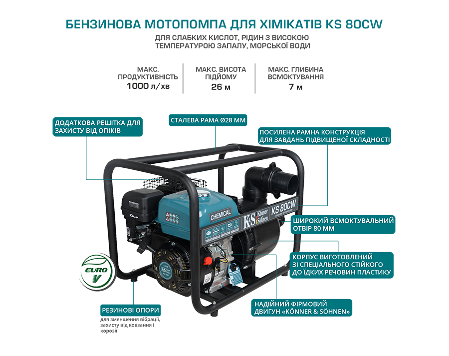 Мотопомпа KS 80CW для агрессивных жидкостей торговой марки Könner & Söhnen предназначена для перекачки морской воды, слабой кислоты, жидкостей с высокой температурой воспламенения. Ее можно использовать в сельском хозяйстве для внесения удобрений, химической и строительной промышленности для транспортировки ядовитых веществ, химических растворов. Не подходит для перекачки высокоактивных, горючих, едких веществ в жидком состоянии, растворителей или бензина.