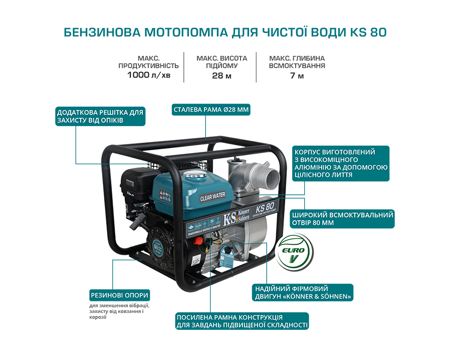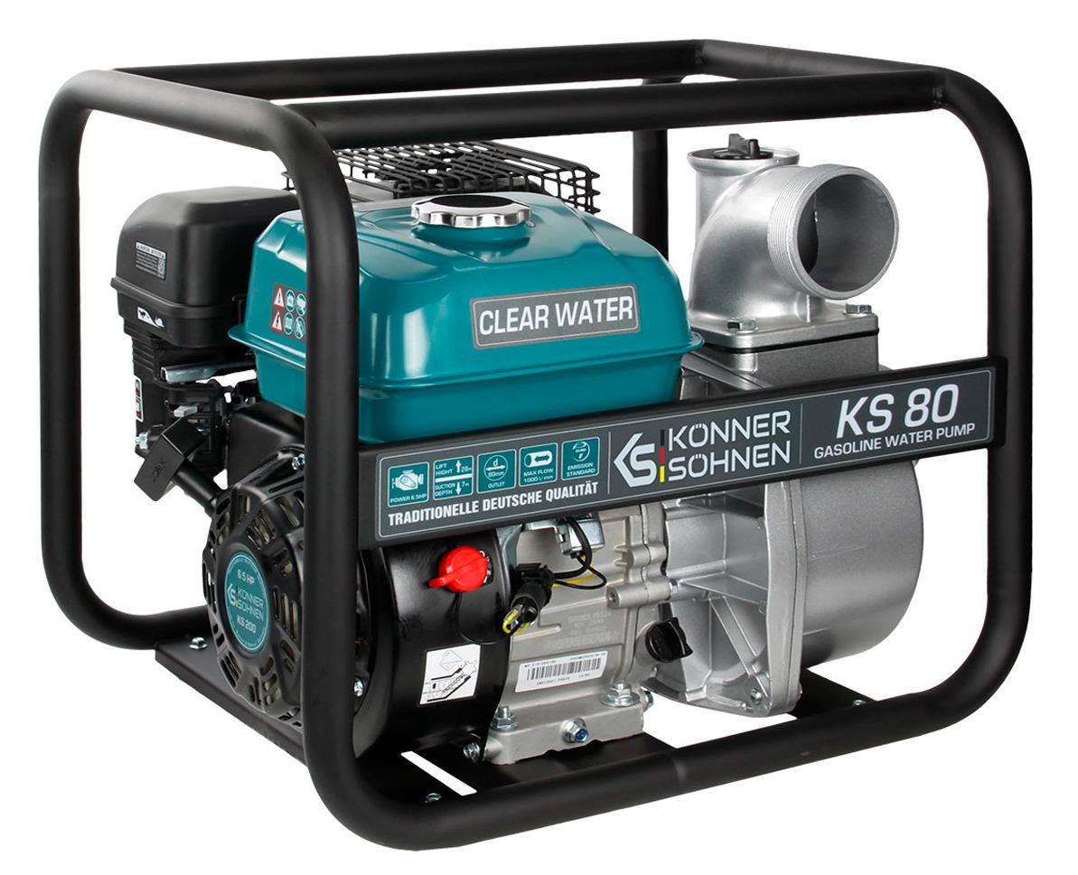 Мотопомпа Konner & Sohnen KS 80 для чистой воды может использоваться для перекачивания жидкости с частицами не более 5-6 мм. Перед началом работы насос помпы необходимо заполнить чистой водой. После старта помпу нужно остановить через 30 секунд после запуска и долить воду в помпу для увеличения производительности. Приводом насоса служит 1-цилиндровый 4-тактный двигатель внутреннего сгорания с воздушным охлаждением объемом 208 см.куб. и мощностью 7 л.с. с ручным запуском. Топливный бак ёмкостью 3.6 л обеспечивает продолжительное время работы. Производительность мотопомпы может достигать 1000 л/мин при максимальной глубине всасывания 8 м и максимальной высоте подъема 30 м.