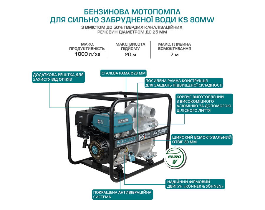 Мотопомпа Konner&Sohnen KS 80MW для грязной воды может использоваться для перекачивания жидкости с частицами не более 2×2.5 см. Перед началом работы насос помпы необходимо заполнить чистой водой. После старта помпу нужно остановить через 30 секунд после запуска и долить воду в помпу для увеличения производительности. Приводом насоса служит 1-цилиндровый 4-тактный двигатель внутреннего сгорания с воздушным охлаждением объемом 269 см.куб. и мощностью 9 л.с. с ручным запуском. Топливный бак ёмкостью 3.6 л обеспечивает продолжительное время работы. Производительность мотопомпы может достигать 1000 л/мин при максимальной глубине всасывания 7 м и максимальной высоте подъема 20 м.