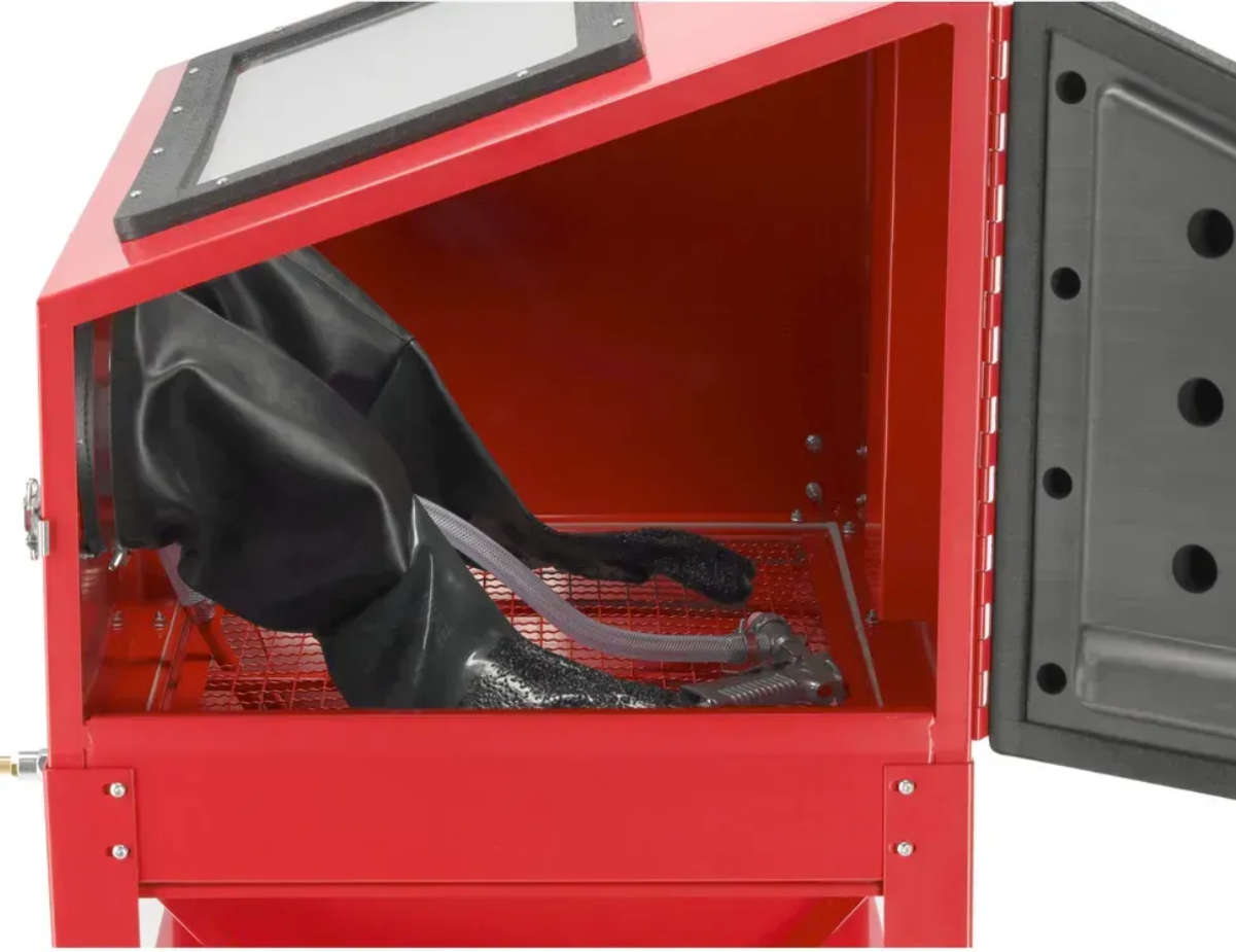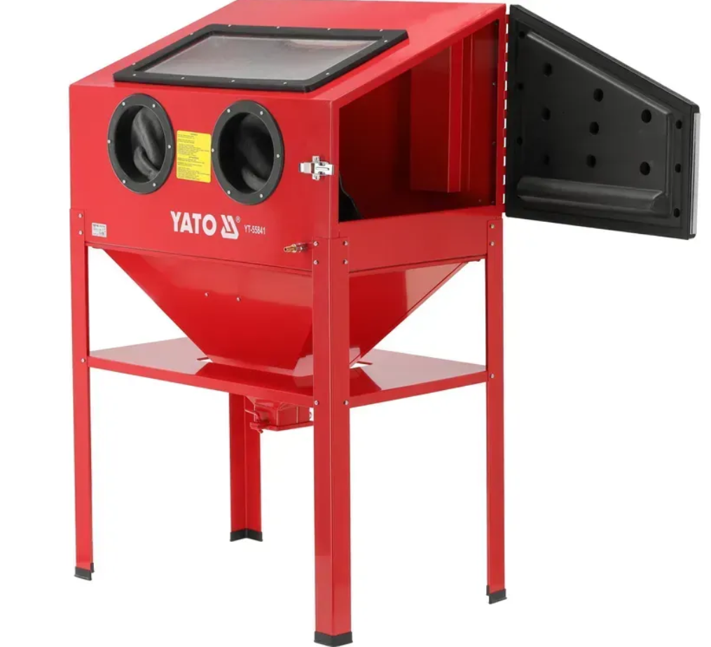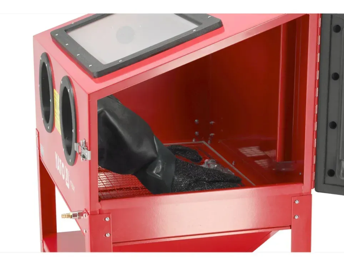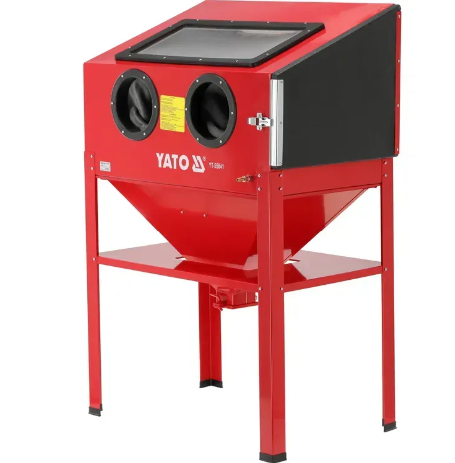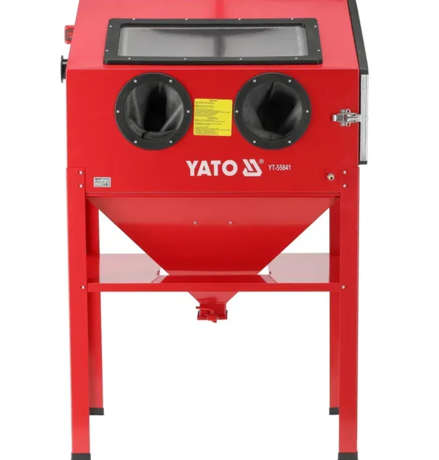 Пневматическая кабина пескоструйная машина YATO YT-55841 для быстрой и удобной очистки от ржавчины, краски и грязи с помощью циркулирующего абразива. незаменимая в автомобильных мастерских и на промышленных предприятиях.