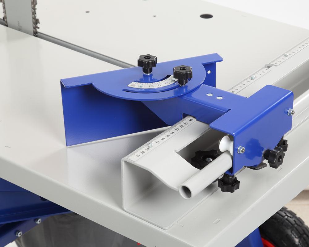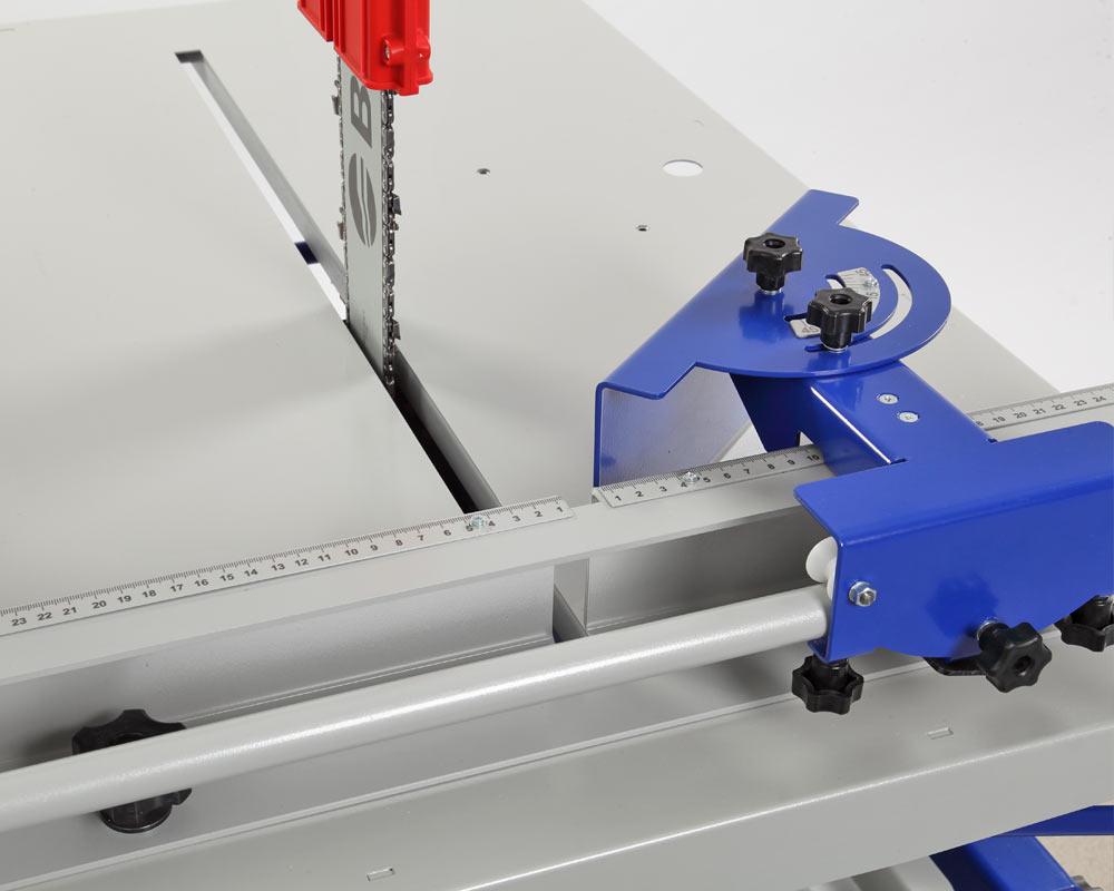 Рабочий стол станка подвижный, перемещается «вдоль шины». К корпусу он крепится с помощью системы подвижных кронштейнов. Для проведения прямых резов на рабочий стол перпендикулярно шине устанавливают упор, на котором имеется круглая ось — рукоятка. Взявшись за неё, удобно перемещать стол, не поднося руки близко к цепи. Если нужна резка под углом, на оси закрепляют специальный угловой упор с возможностью настройки требуемого угла. Станок позволяет также снимать фаски с блоков. Эту операцию проводят с помощью фасочного упора.