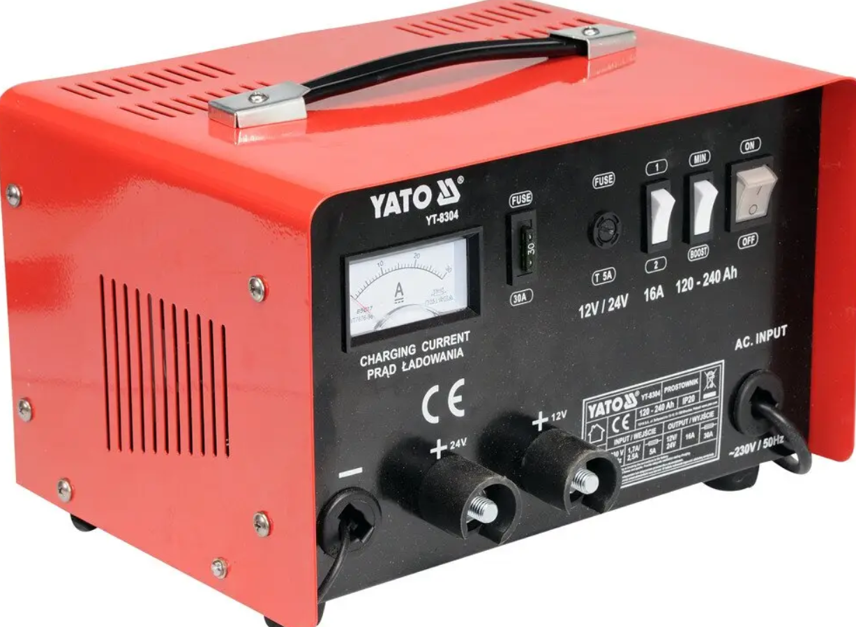 Профессиональное устройство YATO YT-8304 для зарядки кислотно-жидкостных аккумуляторов напряжением 12 В / 24 В и емкостью от 120 Ач до 240 Ач. Выпрямитель с регулировкой зарядного тока и функцией поддержки зарядки BOOST. Он имеет высокопроизводительный трансформатор, предохранители от перезаряда и перенапряжения и 2 режима зарядки: быстрый и медленный. Предназначен для легковых автомобилей, фургонов и грузовиков.