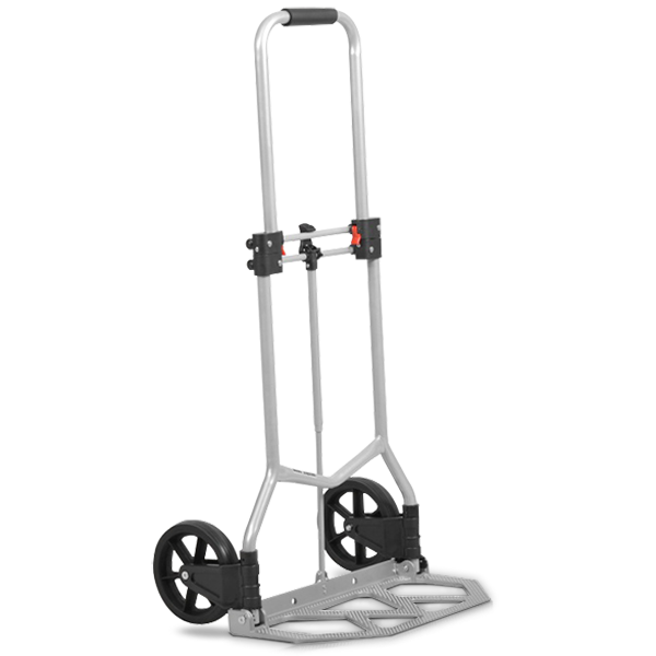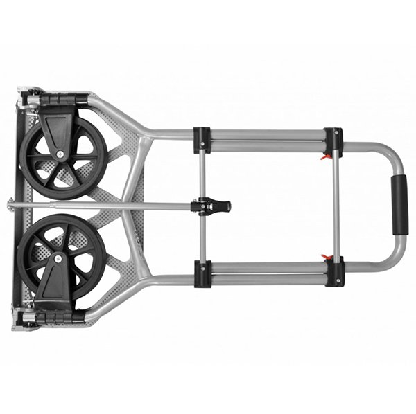 Благодаря большим прочным колесам вы также можете без проблем преодолевать ступеньки с грузом. Ручка транспортной тележки из мягкого материала удобно лежит в руке. С грузом 4,35 кг алюминиевая грузовая тележка и высококачественный пластик очень легки и просты в обращении.
