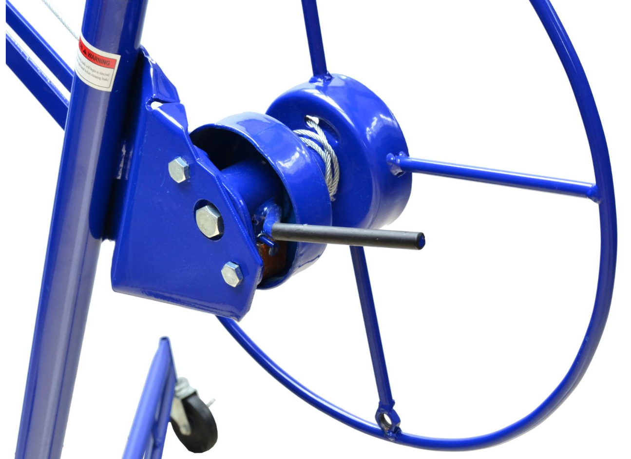 Широкая колесная база с возможностью блокировки делает устройство очень стойким даже при подъеме крупногабаритных гипсокартонных плит. Дополнительным большим преимуществом подъемника является возможность его сборки, благодаря чему он занимает относительно мало места.
