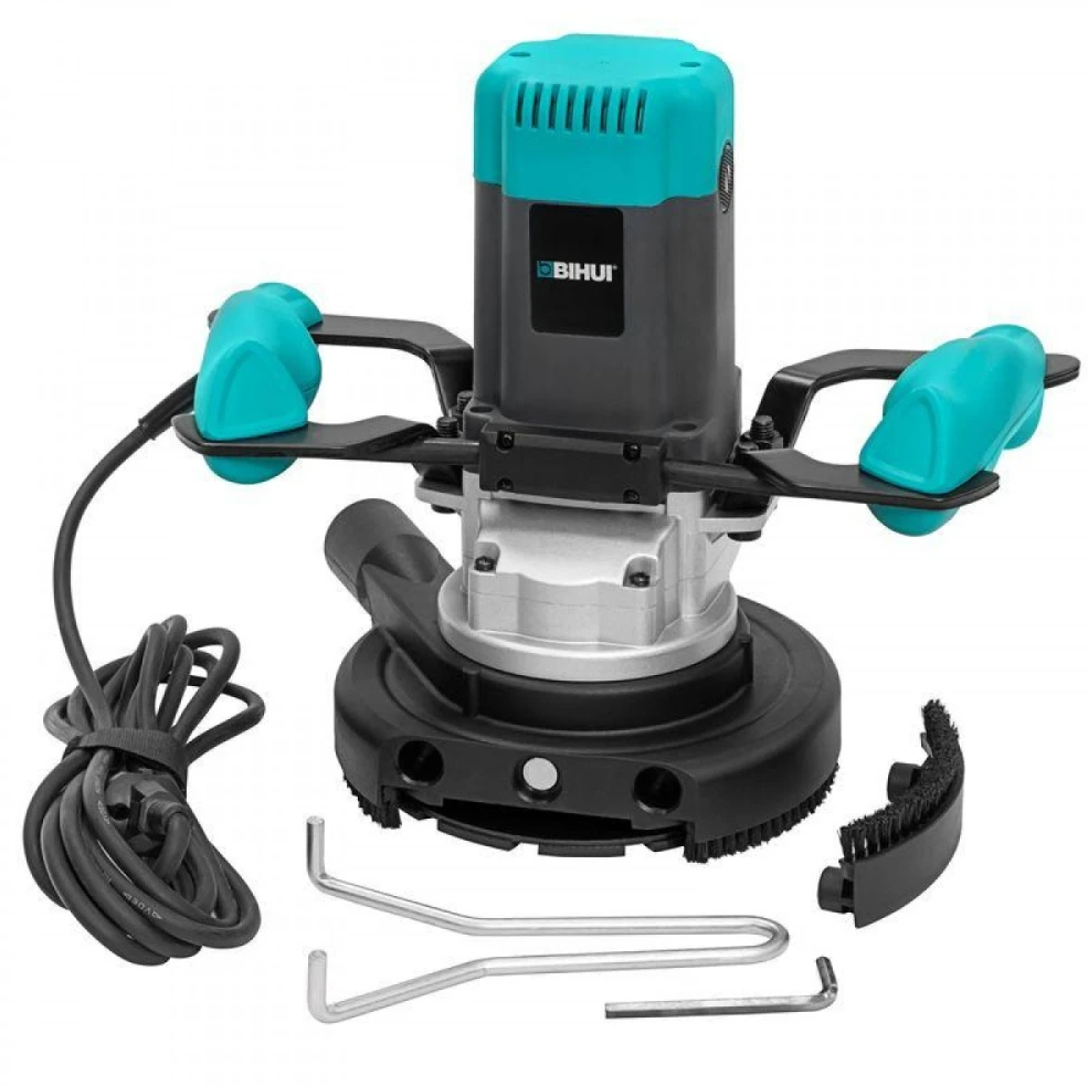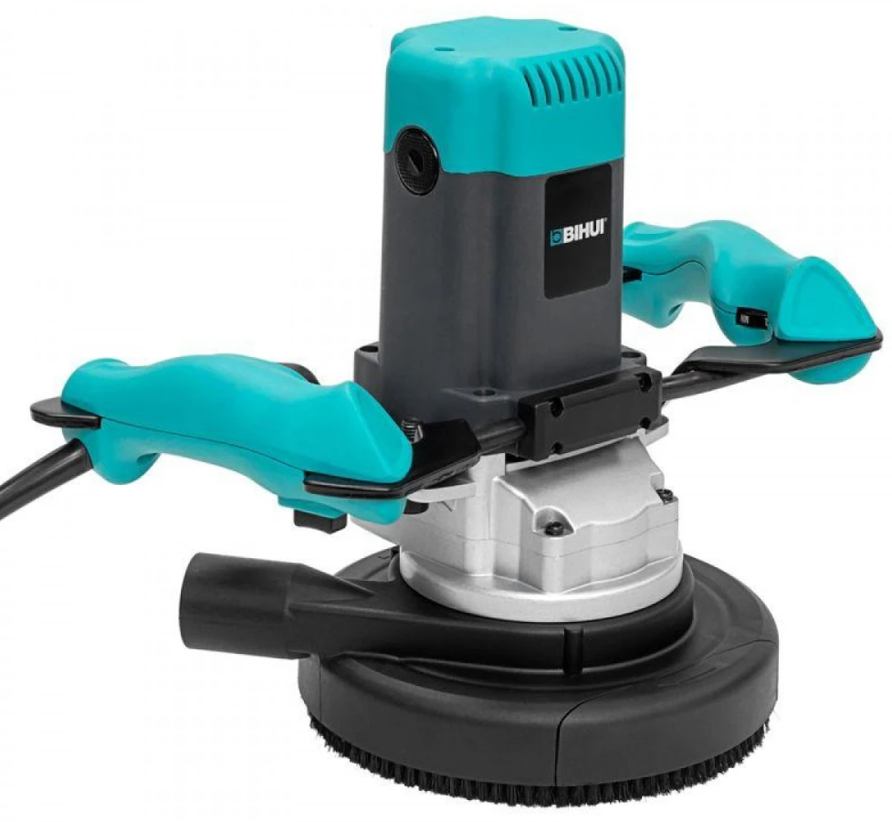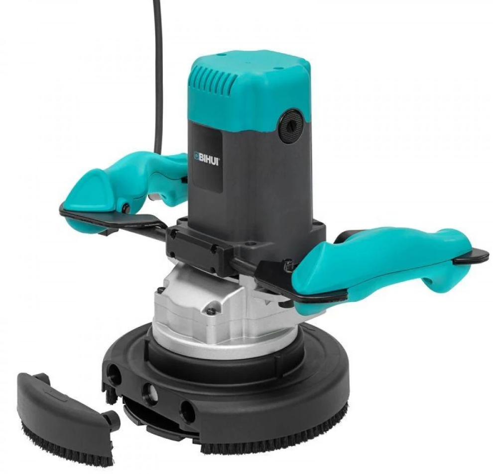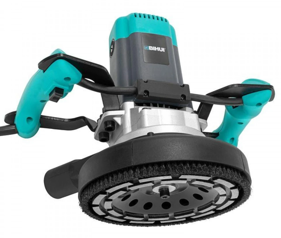 Шлифовальная машина по бетону BIHUI - это специализированный инструмент. Он помогает с первого раза убирать цементные горбы с больших бетонных поверхностей. За счет механизма планетарного действия – разностороннего движения планшайб на основном диске, за счет функции регулировки скорости вращения и возможности установить специальные диски-чаши с алмазными наконечниками. Инструмент представляет собой круглую опорную поверхность с мотором, основной и дополнительной рукояткой и патрубком для пылесоса. Из элементов управления у шлифмашины есть кнопка включения, блокировка пусковой кнопки и шпинделя, регулировочный винт глубины шлифования.