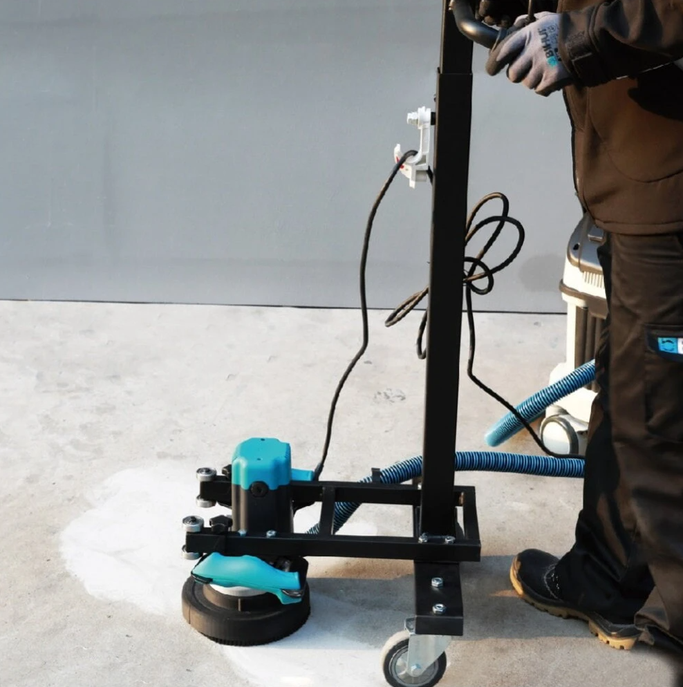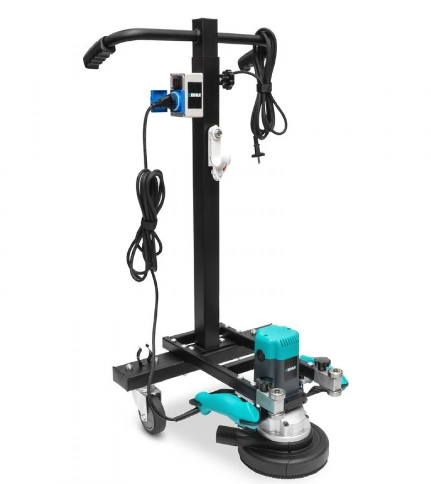 Станина предназначена для шлифовальной машины по бетону BIHUI. Значительно упрощает труд мастера, бережет вашу спину от перенапряжения и разуметься ускоряет рабочий процесс. Высота ручек регулируется с помощью прижимного болта и может составлять от 970 мм до 1100 мм. Имеет удобные крючки для провода для того, чтобы он не мешал в процессе шлифования. Станина имеет качественные колеса, которые помогают с легкостью перемещать станину и управлять гриндером во время работы.