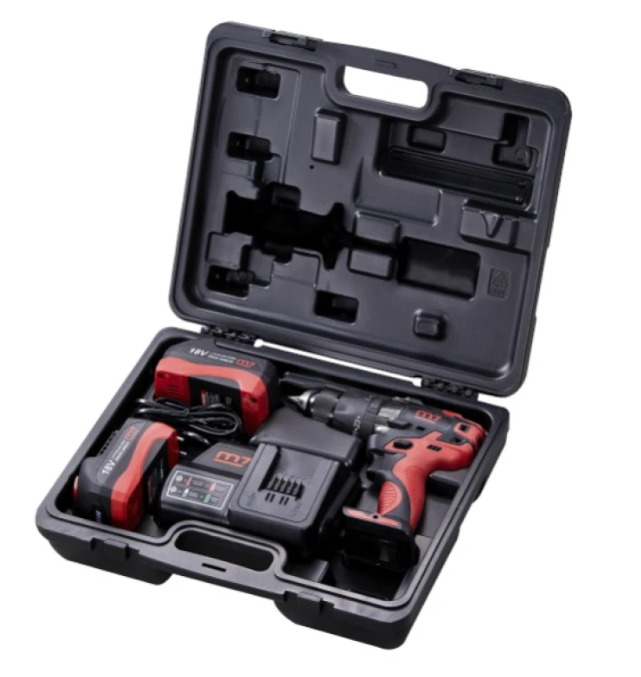 Шуруповерт Mighty Seven DD-20502 поставляется в фирменном защитном кейсе с 2 аккумуляторами ёмкостью 5 А*ч и зарядным устройством.