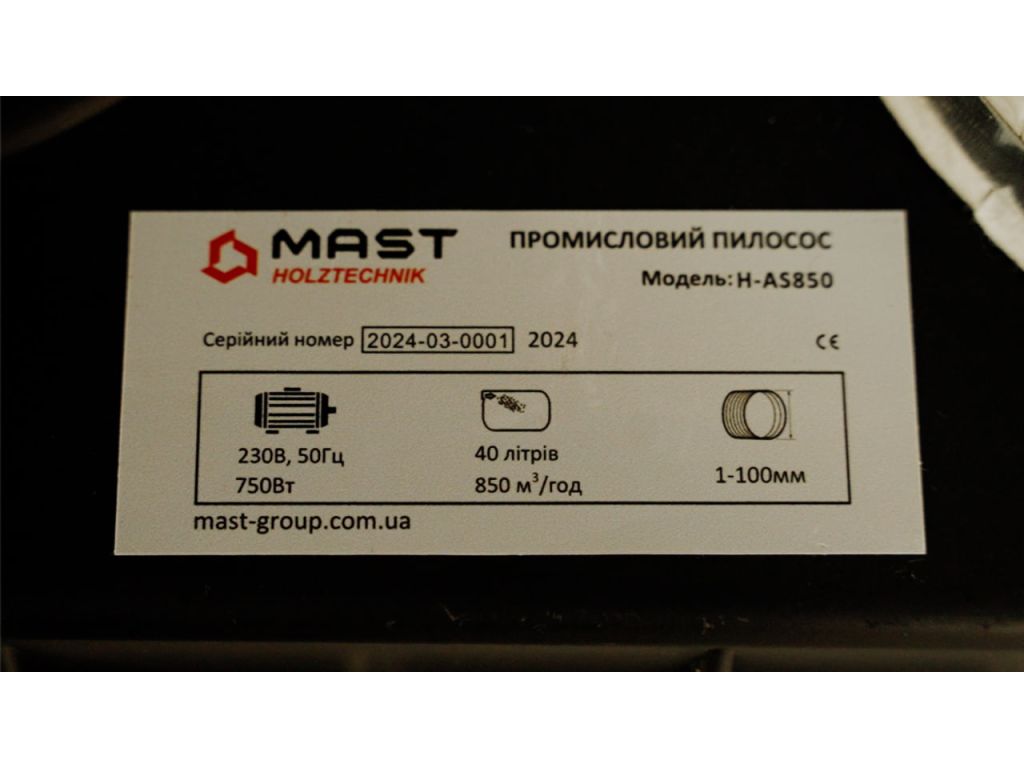 MAST Holztechnik H-AS850 оснащена двигателем мощностью 750 Вт, что обеспечивает стабильную и надежную работу системы. Она работает от стандартного напряжения 230 В, что делает её удобной для использования в большинстве мастерских без необходимости в специальной электросети.