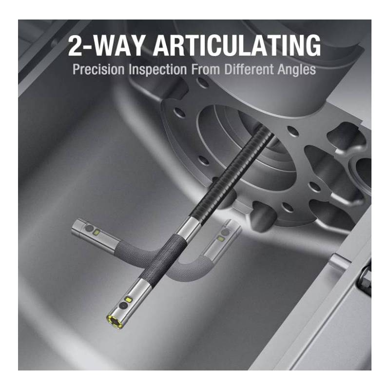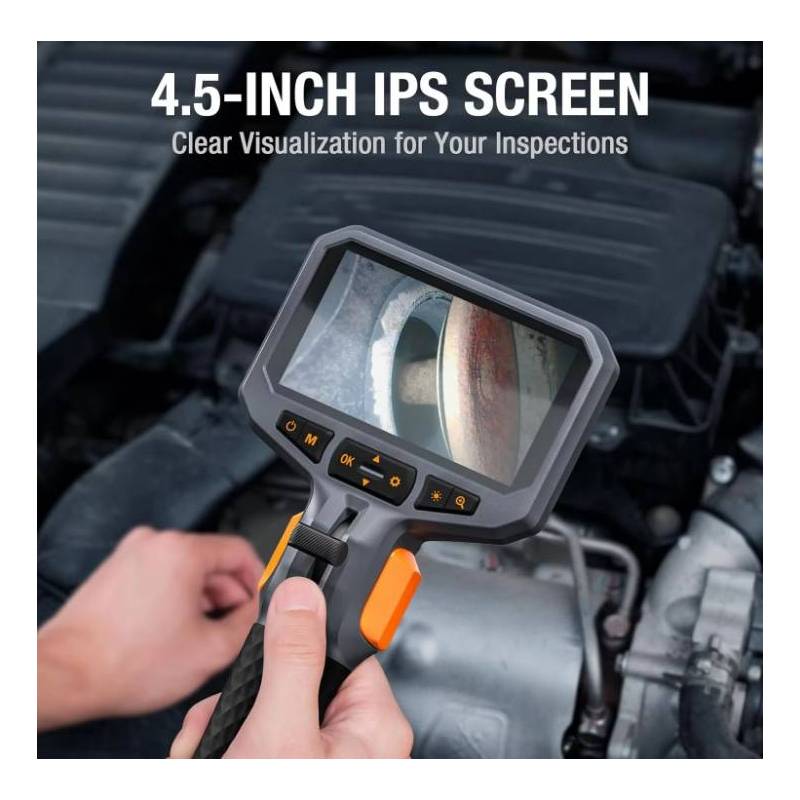 Видеоэндоскоп Teslong TD450S с управляемым поворотным зондом диаметром 8,5 миллиметра. 2 камеры на зонде! Угол поворота зонда 210 градусов, поворот возможен по двум направлениям. Эндоскоп Teslong TD450S имеет две камеры по 2Мп каждая, с разрешением 1080P, угол обзора обеих камер 70°, подсветка основной камеры 8 LED светодиодов, боковой 1 LED светодиод. Видеоэндоскоп оснащен трубчатым полужестким кабелем длиной 1 метр, который хорошо держит заданную форму, а также с его помощью можно проталкивать зонд под разными углами или в местах сильного загрязнения. Управление поворотом зонда производится с помощью джойстика, расположенного на ручке основного блока устройства. Для удобства рядом с джойстиком поворотного зонда находится кнопка регулировки подсветки камеры, а также кнопка фото/видео записи.