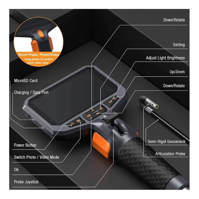 Управляемый технический эндоскоп Teslong TD450S имеет цветной дисплей диагональю 4,5 дюймов, на котором расположены кнопки управления функциями устройства (режимы, настройки, просмотр фото/видео записей, поворот или отображение изображения из камеры, увеличение и прочее). А также на боковой части расположен порт для карты памяти MicroSD и вход USB для подзарядки.