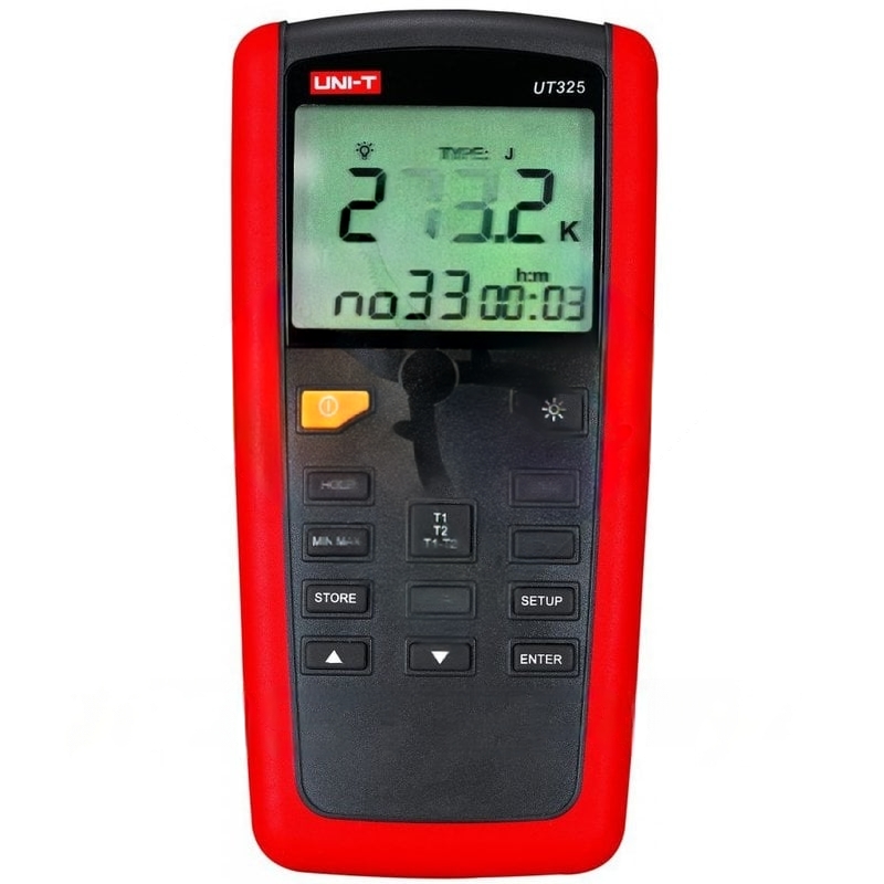 Цифровой термометр позволяет измерить температуру с помощью различных типов термопар (K, J, T, E, R, S, N) в ºC, ºF или К.