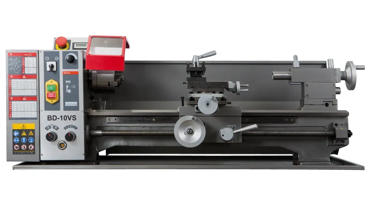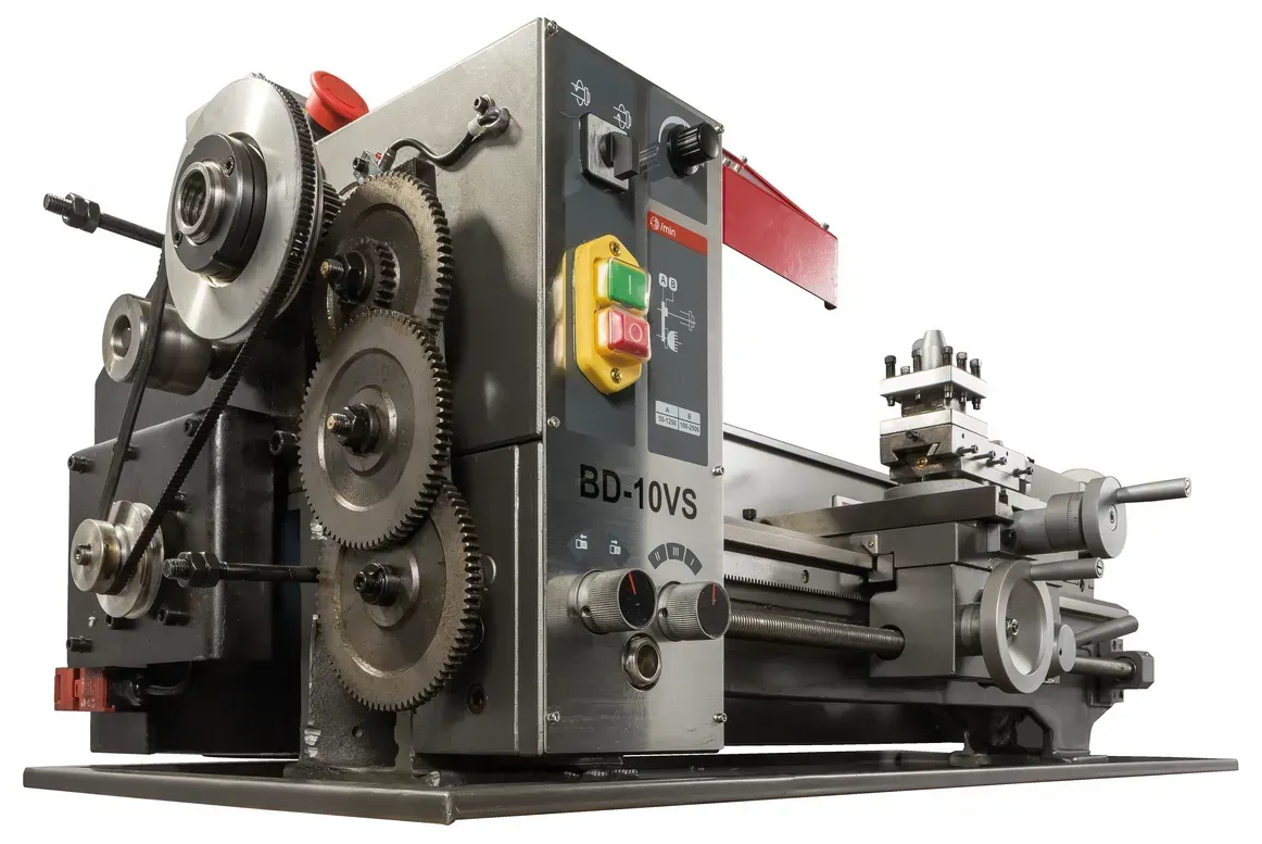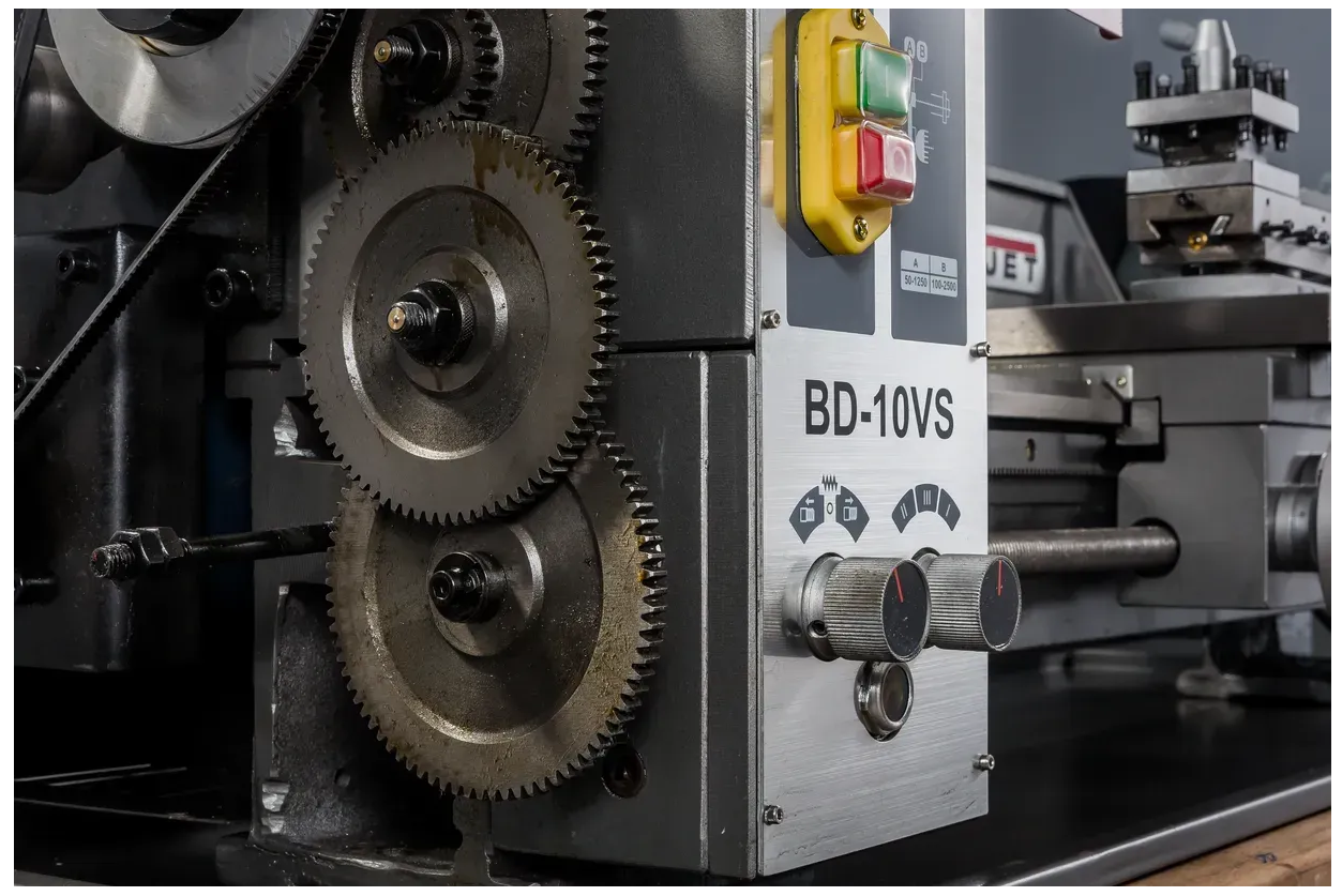 Станок BD-10VS способен нарезать как правую, так и левую резьбу, включая метрическую и дюймовую. В комплекте идут сменные металлические шестерни для нарезки резьбы, которые позволяют настроить коробку подач. После выбора нужной гитары шестерен вы получите три скорости или типы резьбы. Например, с автоматической подачей 0,1 мм на один оборот шпинделя можно получить три варианта: 0,1 мм, 0,2 мм и 0,4 мм на один оборот шпинделя. Имея два набора шестеренок, можно достичь шести автоматических подач без постоянного их перебора — достаточно просто повернуть ручку на панели управления.