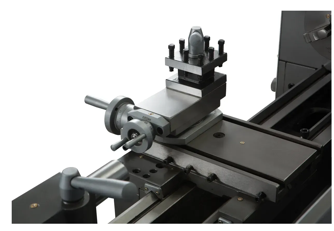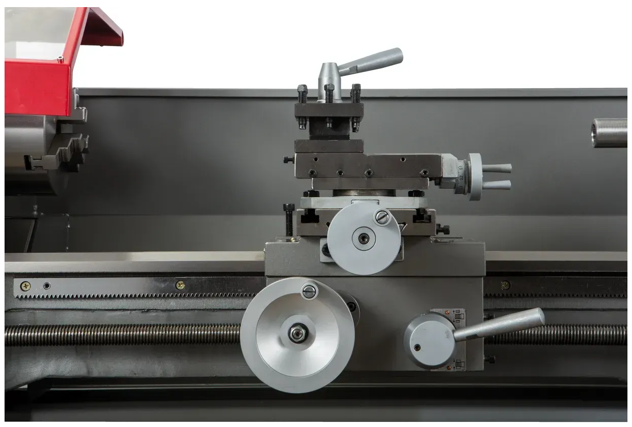 Станок также позволяет изменять направление вращения шпинделя как по часовой, так и против часовой стрелки. Возможность проточки малых конусов осуществляется благодаря повороту каретки малой продольной подачи, а юстировка задней бабки на 10 мм в обе стороны позволяет достичь необходимой точности обработки. Регулировка клиновых планок для поперечной и малой продольной подачи добавляет удобства в работе.