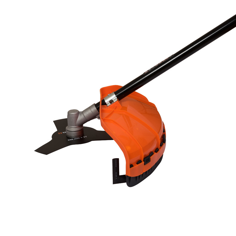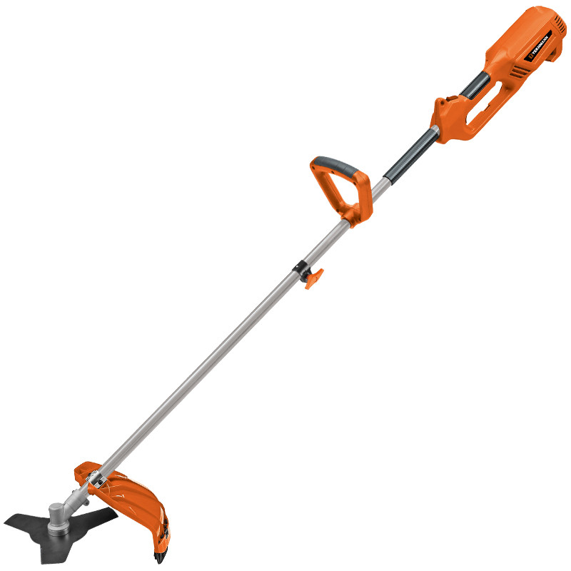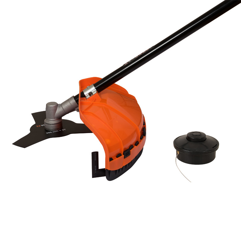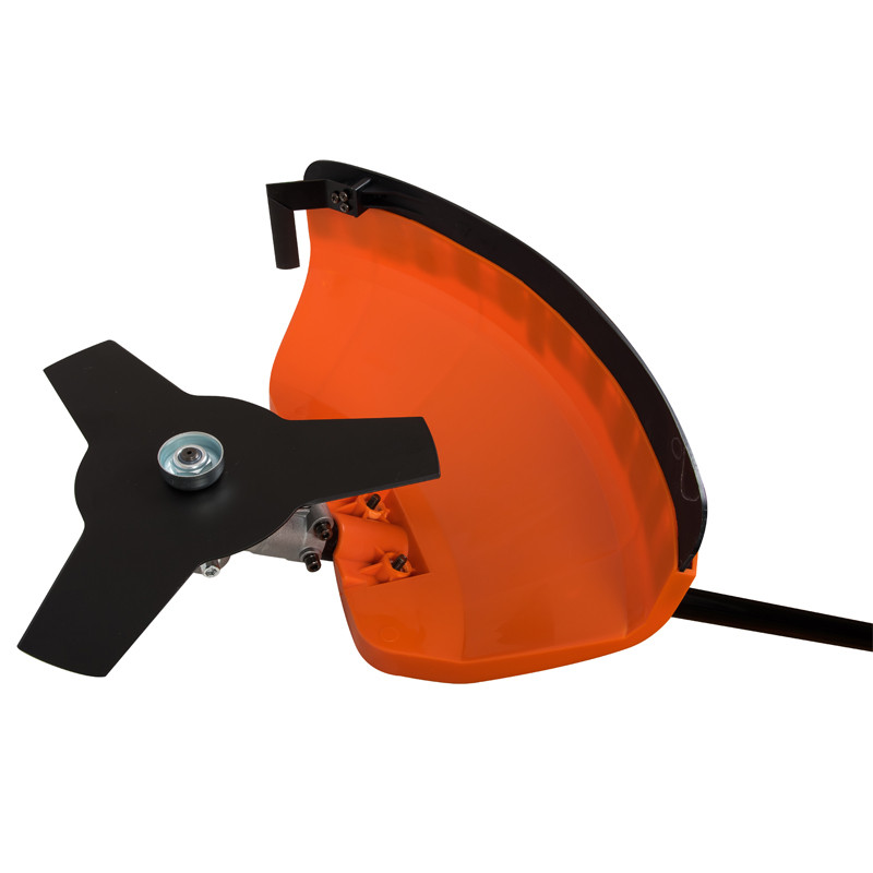 Триммер комплектуется режущей катушкой с леской и трехлопастным ножом. Для предохранения пользователя от разлетающейся травы и твердых предметов при работе на нижней части штанги установлен защитный кожух.Положением наплечного ремня на штанге триммер легко балансируется, уменьшая нагрузку на руки при управлении, тем самым позволяя работать намного дольше и эффективнее.Прямая разъемная штанга гарантирует не только большой запас прочности всей системы, но и помогает легко транспортировать инструмент в разобранном виде.