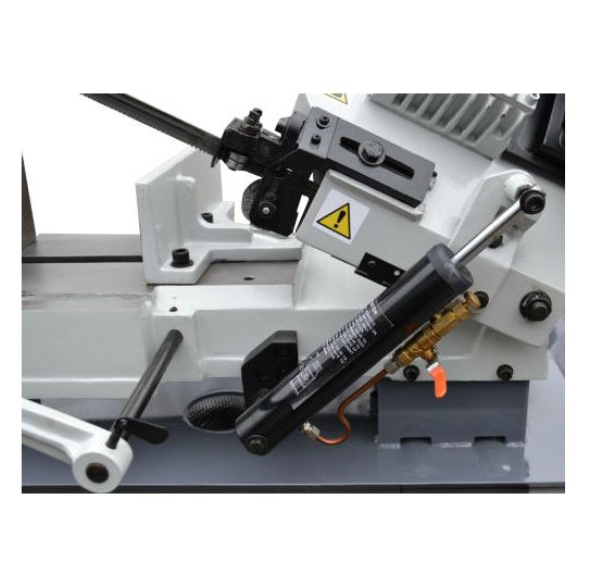 Гидроцилиндр, используемый для опускания головы ленточной пилы, обеспечивает плавное и контролируемое опускание, что позволяет точно контролировать процесс резки. Также гидроцилиндр позволяет зафиксировать режущую голову на любой удобной для конкретной заготовки высоте, чтобы начало опускания головы происходило непосредственно над заготовкой, а не от крайнего верхнего положения.