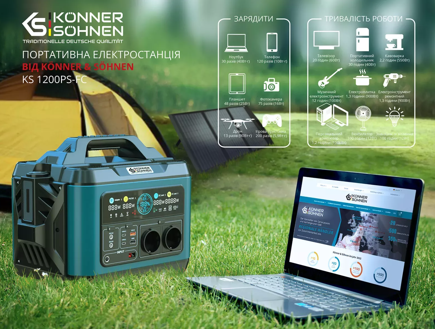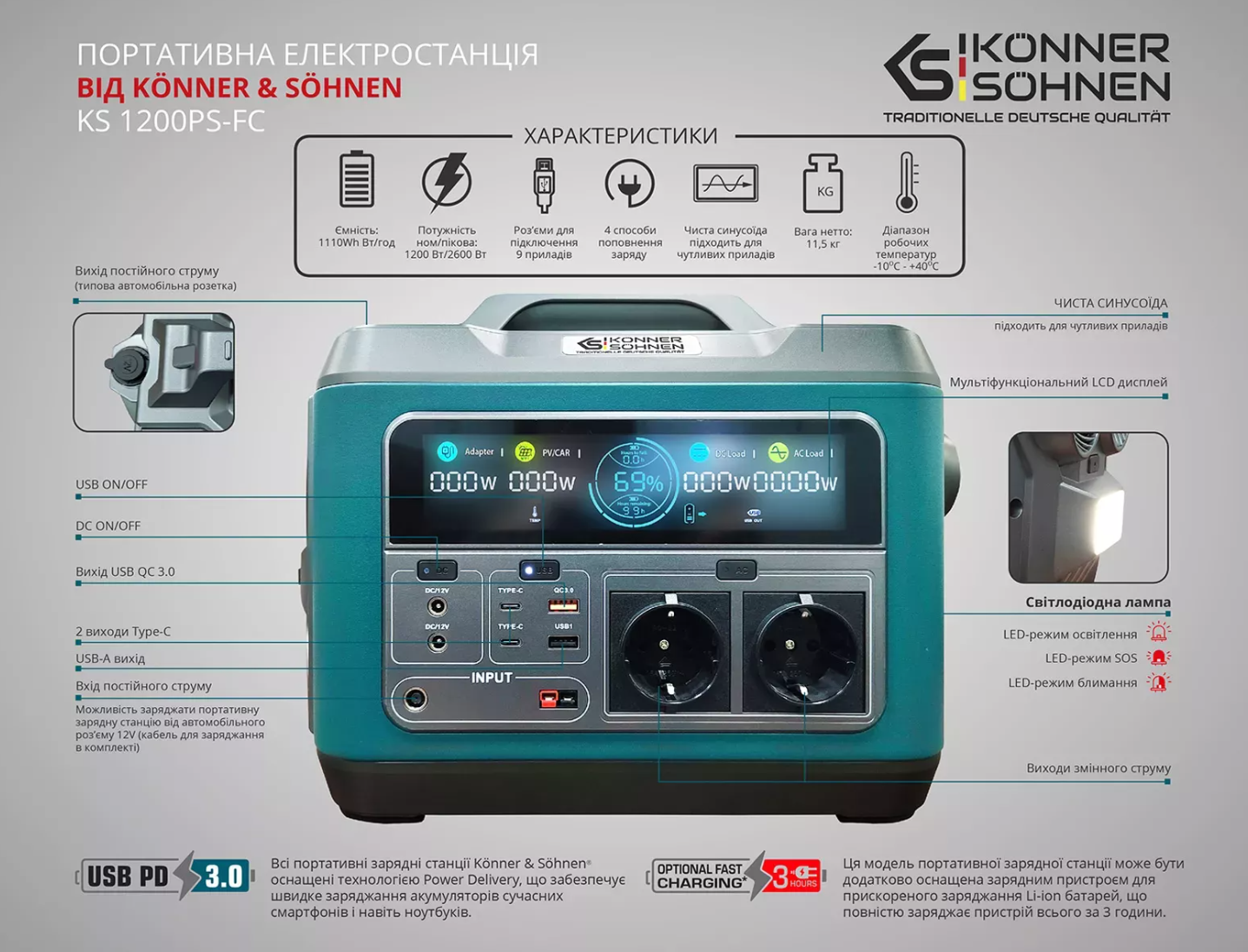 Портативная электростанция KS 1200PS-FS от немецкого бренда Könner&Söhnen представляет собой высокоэффективное устройство для зарядки различных электронных приборов в пути или при отключении электричества. Она обеспечивает быструю и надежную зарядку благодаря мощной литий-ионной батарее, множеству разнообразных портов и чистой синусоиде.