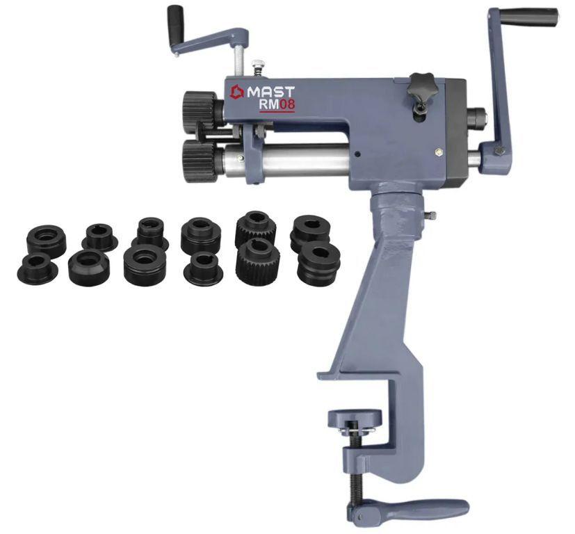 Зиговочный станок MAST Metalltechnik RM 08 – это компактное, портативное оборудование для создания ребер жесткости, формирования бортов и фальцевых соединений на листовом металле толщиной до 0,8 мм. Комплектуется шестью наборами сменных роликов разного профиля, что позволяет выполнять разнотипные операции.