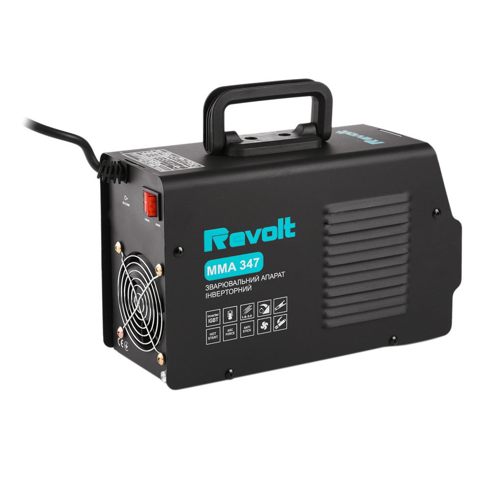 Revolt MMA-347 рассчитан для бытового и полупромышленного использования. Благодаря дополнительному регулированию можно настраивать оптимальные параметры в различных ситуациях. Имеет небольшой вес, удобный для транспортировки. Большим преимуществом инверторного аппарата является работа с пониженным напряжением в сети. В условиях частой нестабильности напряжения в стационарных сетях этому устройству будет достаточно даже 160 В для нормальной работы.