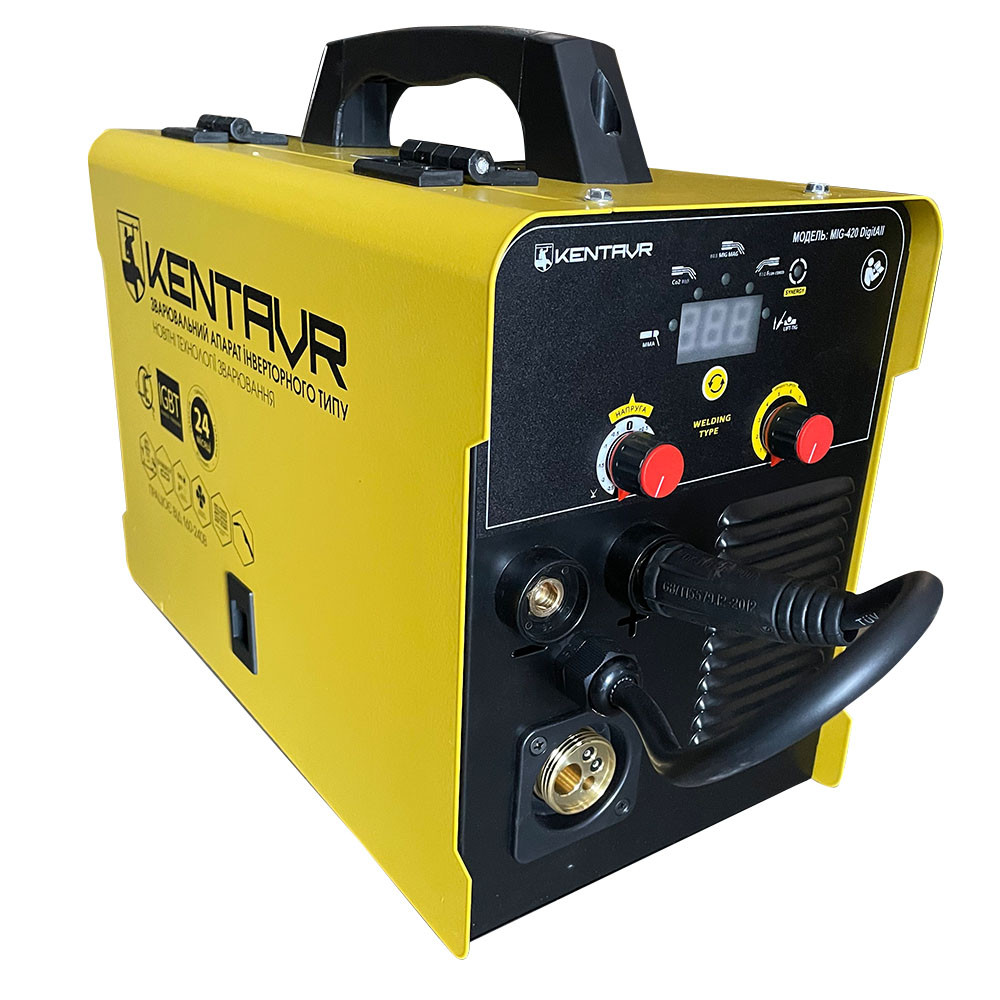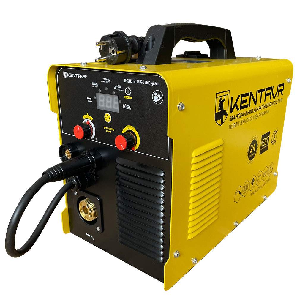 Однофазный переносной сварочный аппарат Кентавр MIG-350 DigitAll — это уникальный и надежный помощник, доступный для массового покупателя. Данный аппарат компактный, с высоким рабочим циклом. Предназначен для полуавтоматической сварки стальной проволокой в среде инертного/активного защитного газа MIG-MAG и обеспечивает качественный шов при использовании флюсовой проволоки (без подключения газового баллона). Также аппарат применим для ручной дуговой сварки штучным электродом MMA.