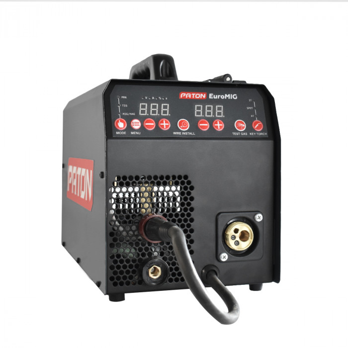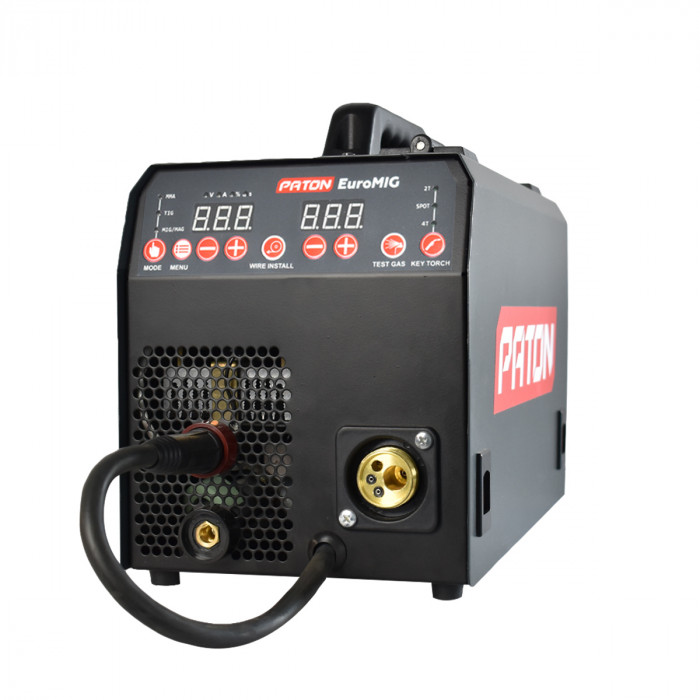 Цифровой инверторный полуавтомат PATON EuroMIG – это аппарат однокорпусного типа исполнения, предназначенный для полуавтоматической сварки (ПА «MIG/MAG») полуавтоматической сварки (ПА «MIG/MAG»), ручной дуговой сварки (РДС «MMA»), аргонодуговой сварки (АРГ «TIG») на постоянном токе в среде защитных газов и смесей. В аппарате EuroMIG-160 реализован полностью цифровой способ управления, за счет чего обеспечиваются его многофункциональность и широкие возможности по точной настройке режимов сварки. Выдаваемый аппаратом номинальный ток до 150А, дает возможность работать любыми электродами диаметром от 1,6 мм до 4 мм и сплошной сварочной проволокой диаметром от 0,6 мм до 1,0 мм. Отдельный закрытый отсек для сварочной проволоки улучшает ее защиту от пыли и других загрязнений. PATON EuroMIG оборудован 2-х ролликовым металлическим механизмом подачи проволоки, а универсальный разъем KZ-2 типа ""ЕВРО"" позволяет подключать сварочные горелки от широкого ряда производителей. Модель EuroMIG, в сочетании с высокой мощностью и производительностью, имеет небольшой вес и габаритные размеры. Аппарат комплектуется качественными аксессуарами, которые позволяют сразу начать работать в режимах MIG/MAG и MMA.
