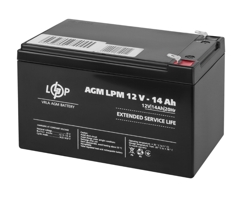 Опис LPM 12V - 14 AH Опис LPM 12V - 14 AH Свинцево-кислотний акумулятор LPM 12 - 14 AH – це оптимальне рішення, якщо вам потрібний надійний і доступний за своєю ціною пристрій для забезпечення безперебійного живлення вашої техніки. Представлена модель кислотного акумулятора виконана із застосуванням сучасної технології AGM (Absorbent Glass Mat), завдяки чому кислотний АКБ LPM 12 - 14 AH більш надійний в експлуатації та відрізняється від своїх попередників тривалішим терміном служби. Основні характеристики LPM 12 - 14 AH: ● Тип акумулятора: AGM свинцево-кислотний ● Номінальна напруга: 12 V ● Ємність АКБ: 14 Ah ● Температура зберігання: -20°С – +50°С ● Робоча температура: +25°С + /-5°С Однією з переваг акумулятора LPM 12 - 14 AH є його універсальність та високий рівень безпеки для користувачів за рахунок герметичного корпусу, виконаного з високоміцного пластику. Характеристики LPM 12V - 14 AH Тип: AGM свинцево-кислотний Номінальна ємність, Ah: 14 Внутрішній опір, mOm: 17 Номінальна напруга, V: 12 Зарядна напруга (буферний режим), V: 13.5-13.8 Зарядна напруга : 14.5-14.9 Максимальний струм заряду, A: 2.8 Струм короткого замикання, A: 630 Номінальний струм заряду, A: 1.4 Пусковий струм, А: 210 (5c) Тип клеми: T2 Кількість циклів: 400 Температура зберігання АКБ, °C 20 ~ +50 Робоча температура заряду, °C: -20 ~ +50 Робоча температура розряду, °C: -20 ~ +50 Матеріал корпусу: пластик Довжина, мм: 150 Ширина, мм: 98 Висота, мм: 99 Висота з клемами , мм: 103 Гарантія, міс: 12 Вага, кг: 3,8 від інтернет-магазину king-tools.com.ua необхідно оформити онлайн заявку або зателефонувати за номерами які вказані на сайті. Також ви можете замовити інші товари від інтернет-магазину king-tools.com.ua за найкращою ціною та оформити доставку по всій Україні: Харків, Київ, Одеса, Запоріжжя, Львів, Дніпро, Рівне, Івано-Франківськ та інші міста України.