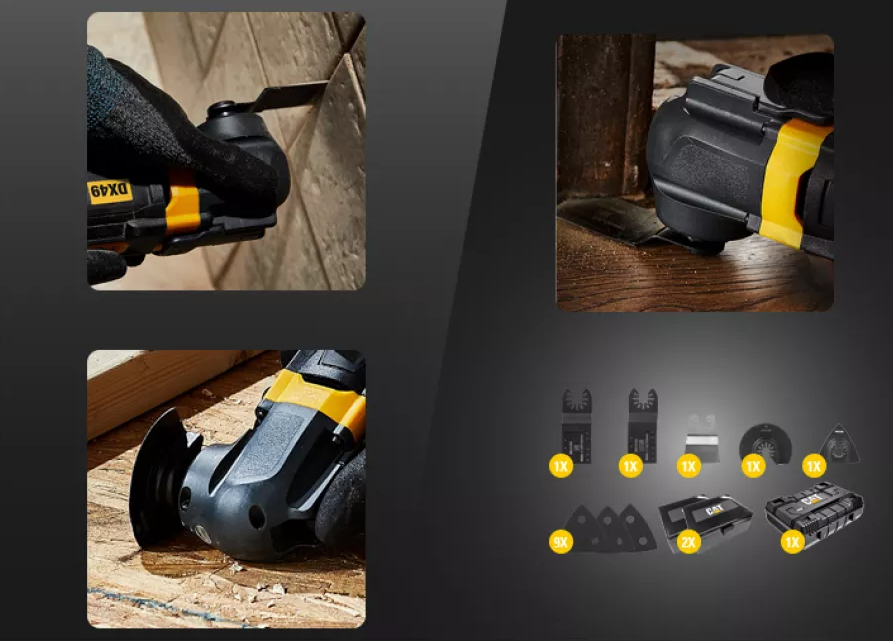 Реноватор CAT DX49.1 — це не просто інструмент, а цілий набір можливостей, готовий до різних завдань. У комплекті ви отримуєте п'ять насадок, кожна з яких стане вашим незамінним помічником:
