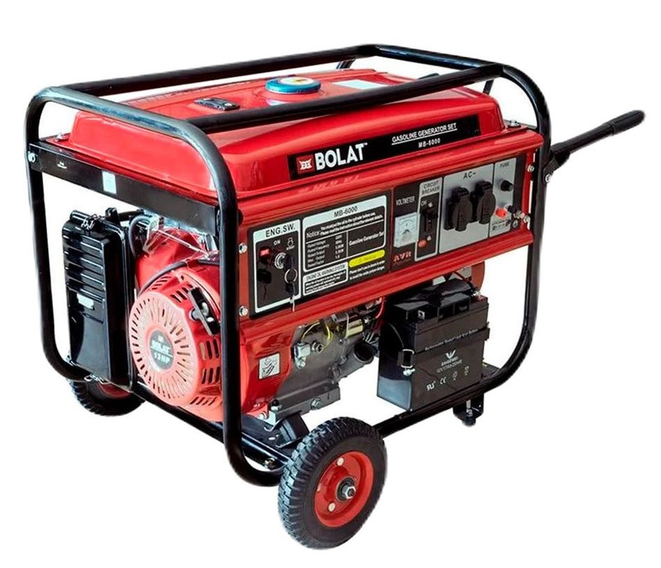Бензиновий генератор Bolat MB-6000 - потужний генератор для автономної та аварійної подачі електроенергії для будівельних майданчиків. Надійний високоякісний двигун 1-го класу потужністю, простий у обслуговуванні та практичний у використанні. Забезпечити електрикою усі прилади будинку (у тому числі енергоємні), а на будівельному майданчику – усі інструменти. Використовується для енергонезалежності заміських будинків, офісів, торгових точок в аварійних ситуаціях на лініях електропередач, а також як мобільне джерело електрики для комунальних та дорожніх служб.