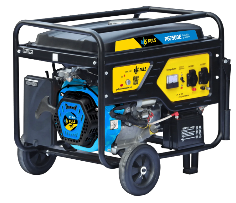 Побутовий бензиновий генератор PULS PG7500E оснащений одноциліндровим 4-тактним двигуном OHV потужністю 15 к.с., що виробляє 7000 робочих ват і 7750 стартових ват.