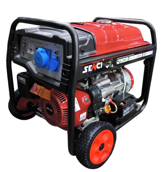 Senci SC10000E - продуктивний бензиновий генератор з номінальною потужністю 7.5 кВт, при роботі генерує напругу 220 В, яку можна використовувати для підключення електроінструментів або обладнання. На корпусі є 2 розетки на 220 В. Вбудований бак на 25 л дозволяє працювати до 8 годин при навантаженні 100%. У цій модифікації генератора встановлений електростартер.