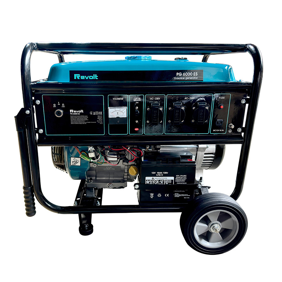 Бензиновий генератор Revolt PG6000 ES – використовується у місцях з відсутністю стаціонарної електромережі для живлення приладів та інструментів. Передбачено ручний та електричний запуск. При короткому замиканні подача струму вимикається автоматично. Металева рама оберігає внутрішні елементи електростанції від ударів. Бензиновий генератор Revolt PG6000 ES – потужний та перевірений апарат, який зможе стати резервним джерелом живлення за відсутності основної електричної енергії. Активно використовується у заміських будинках, дачах, на складах, за містом. Ця модель завоювала велику симпатію завдяки чудовому поєднанню гарної якості за доступну ціну. У бензиновому генераторі Revolt PG6000 ES досить потужний чотиритактний двигун типу із охолодженням повітряного типу. Він забезпечить живленням необхідні електричні прилади та інструменти. Перевагою пристрою є можливість використання у будь-яких погодних умовах. Йому не страшні сильні морози чи пил, і навіть висока вологість. Особливістю генератора є мідна обмотка якоря. Сама конструкція виконана з високоякісних матеріалів і за потреби може оснащуватися візком для зручного транспортування. Низький рівень шуму, порівняно з іншими аналогами, забезпечує комфортну роботу. Великий паливний бак забезпечує тривалу роботу без додаткової заправки. Захист від низького рівня масла забезпечує тривалий термін служби двигуна. Характеристики Напруга: 220 В Номінальна потужність: 5500 Вт Максимальна потужність: 6000 Вт Робочий об'єм двигуна: 389 см³ Максимальна потужність двигуна: 13 л.с Витрата палива: 0.6 л/кВт·годин Об'єм паливного бака: 25 л 1.1 л Рівень шуму в робочому режимі: 75 дБ Система запуску: ручний стартер, електростартер Ступінь захисту: IP23 Тип палива: бензин А92, А95 Вага: 81 кг